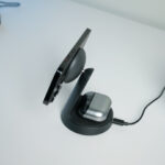 Potete regolare l’angolo di visione in verticale tra i 50 e i 70 gradi, mentre la base ruota di 360 gradi per consentirvi di trovare la posizione migliore in base alle vostre esigenze. Sulla base è presente un secondo punto di ricarica wireless, perfetto per appoggiarci la custodia delle vostre cuffie AirPods e ricaricarne la custodia. Nella confezione di vendita troverete, oltre al supporto di ricarica, anche un caricabatterie da 40 watt e un cavo USB-c/USB-C da 1,5 metri, per essere subito operativi.
