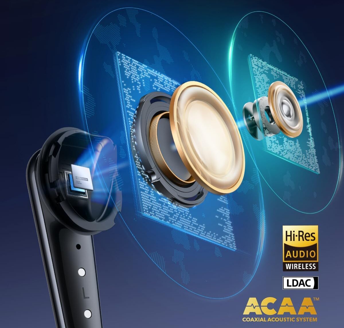 La qualità del suono delle cuffie è garantita da un sistema a doppio driver, con un driver da 10,5 mm per bassi profondi e un tweeter per alti nitidi, mentre i sei microfoni abbinati alla tecnologia di riduzione del rumore filtrano efficacemente il rumore di fondo, assicurando che la voce risulti chiara durante le telefonate.