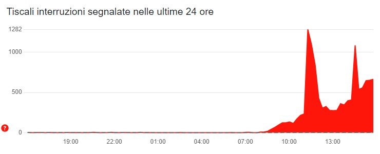 I problemi registrati vanno avanti dalla mattinata di oggi, con un picco di segnalazioni intorno alle 11 e un secondo picco intorno alle 14. Per il momento, le pagine social di Tiscali non hanno confermato i problemi segnalati da diversi utenti e potrebbe essere necessario attendere ancora qualche ora prima di ottenere una risposta ufficiale.