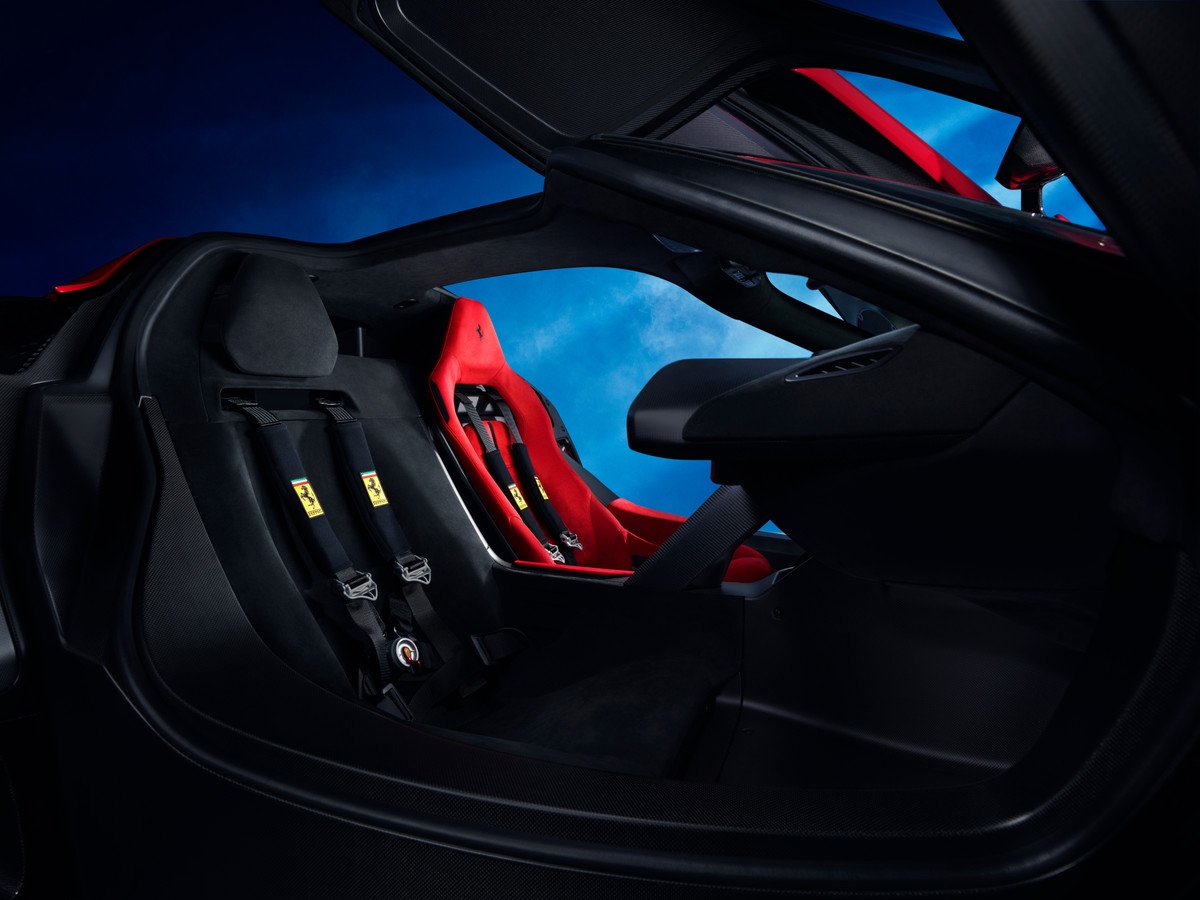Il sedile di chi guida è rosso, quello del conducente quasi non si nota, perché nero e arretrato, diverso anche per altri aspetti: è privo del logo del Cavallino Rampante e con un poggiatesta diverso, parzialmente staccato dallo schienale, per esempio. “Il sedile del passeggero, pur assolvendo a tutte le funzioni ergonomiche, è perfettamente integrato nelle finizioni dell’abitacolo tanto da sparire quasi a una vista d’insieme” sottolinea Ferrari nel relativo comunicato stampa.