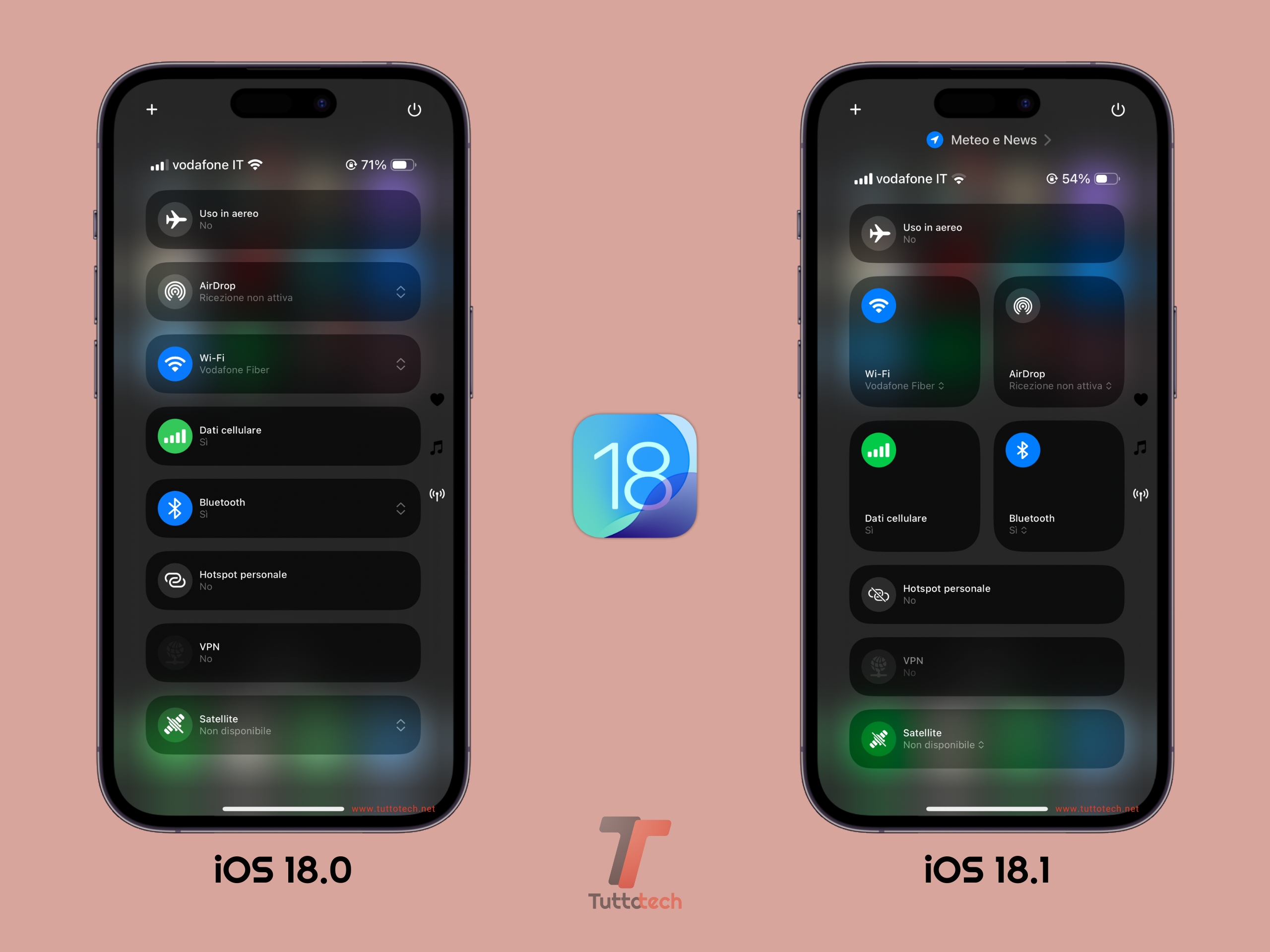 iOS 18.1 implementa numerose modifiche al Centro di Controllo, già profondamente rivisto rispetto al passato con iOS 18. In primo luogo, vi sono modifiche alla scheda connettività (le voci “Wi-Fi”, “Bluetooth”, “AirDrop” e “Dati cellulare” vengono riorganizzate in widget di dimensione 2×2 al posto dei widget estesi 4×1).