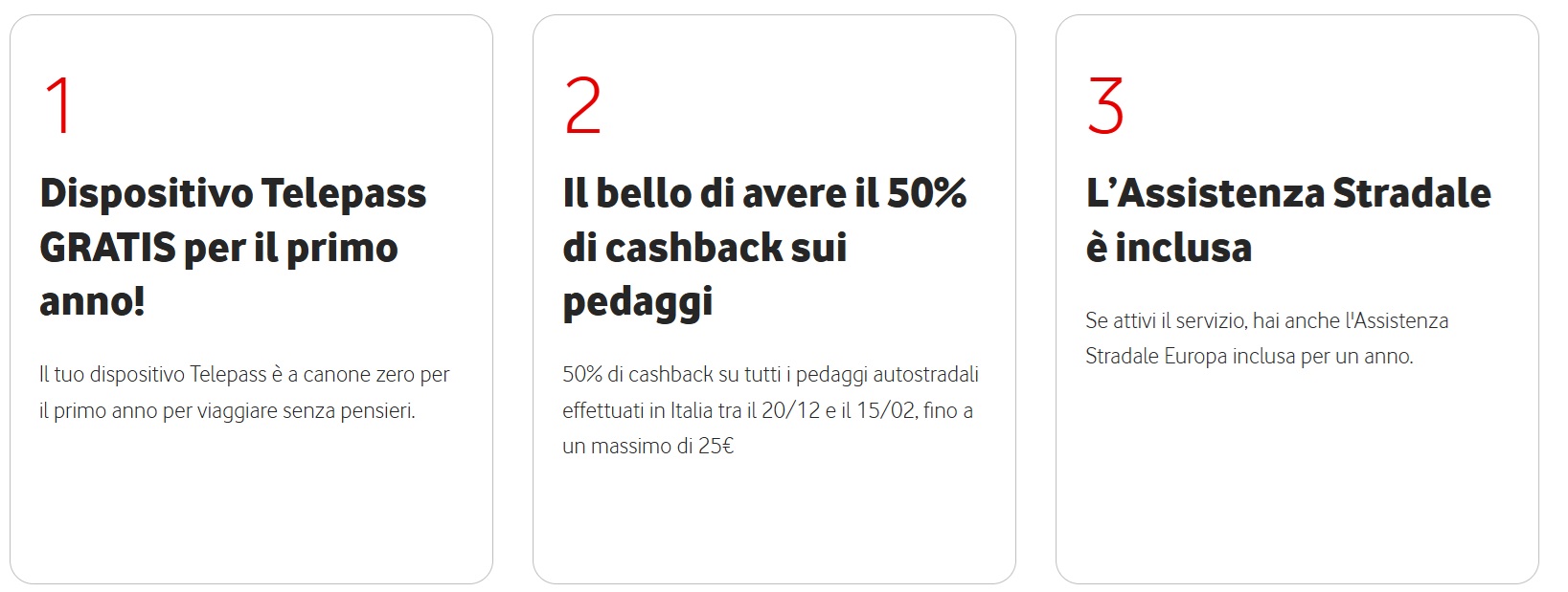 - Canone gratis per la rete fissa Vodafone. Per i nuovi clienti la gratuità è pari a due mesi, mentre per i clienti esistenti, che aggiungono Telepass alla propria offerta, è pari a un mese;