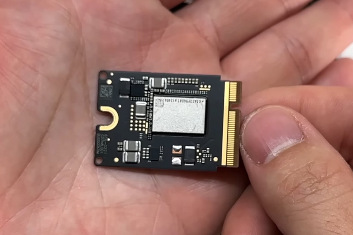 Rimuovendo la ventola e l’altoparlante si accede alla scheda madre sottostante con l’SSD M.2 2230 dall’aspetto apparentemente standard, in quanto l’unità utilizzata da Apple ha un numero di pin diverso.