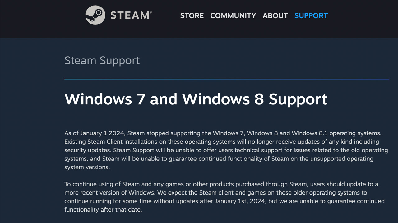 Nel corso delle ultime ore, infatti, Steam ha annunciato attraverso un suo aggiornamento la cessazione del supporto al client per sistemi operativi meno recenti, comprendendo rispettivamente Windows 7 e Windows 8. I giocatori in possesso di un PC con i sopracitati sistemi operativi dovranno dunque necessariamente aggiornare a Windows 10 o Windows 11 (o eventualmente passare ad altri sistemi operativi proprietari, come nel caso di Linux o MacOS) per continuare a giocare ai propri titoli in possesso in formato digital delivery.