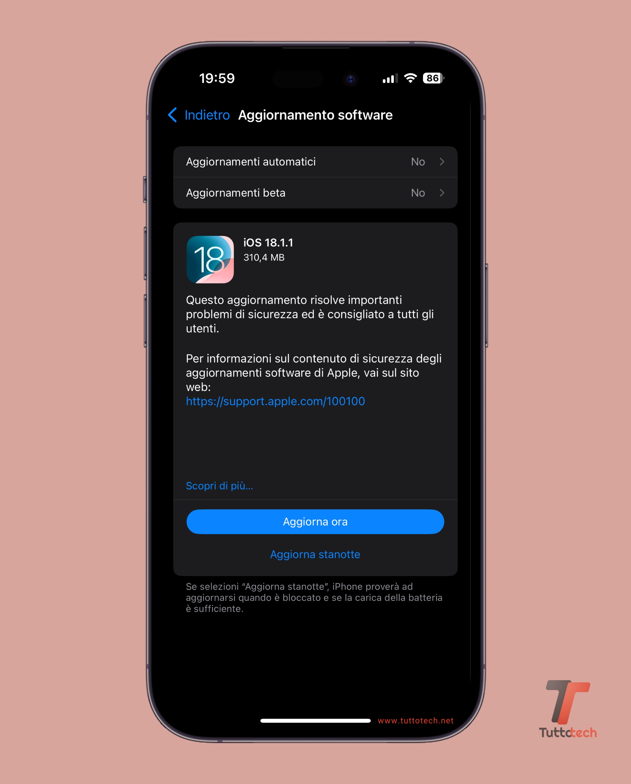 La nuova build “ufficiale” della più recente versione di iOS, disponibile ora su tutti gli iPhone compatibili (ovvero dagli iPhone Xs e iPhone Xr del 2018 in poi), e della più recente versione di iPadOS, disponibile su tutti gli iPad compatibili (dai modelli 2018-19 in poi), è la 22B91 (sostituisce la 22B83 rilasciata come versione stabile di iOS 18.1 e iPadOS 18.1 lo scorso 28 ottobre). Nello specifico di iOS 18.1.1, la build in distribuzione sul canale stabile ha un peso di 310,4 MB su iPhone 14 Pro (provenendo da iOS 18.1).