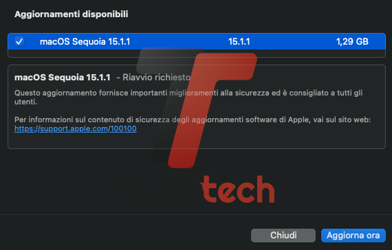 La build che porta con sé macOS 15.1.1 Sequoia ha un peso di 1,29 GB su MacBook Pro 16 M1 Pro (provenendo da macOS 15.1 Sequoia).