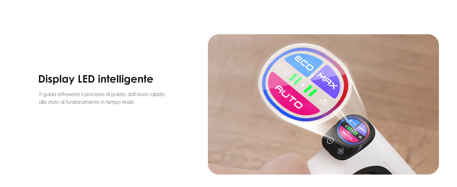 Tra gli accessori troviamo un tubo che può essere piegato per passare sotto ai mobili più bassi senza doversi chinare, e non va dimenticata la batteria rimovibile, che allunga sicuramente la vita utile del dispositivo e permette di averne una di scorta per raddoppiare l’autonomia. Sull’impugnatura, ergonomica sia per la pulizia dei pavimenti che per quella delle parti alte della casa, è presente anche uno schermo a LED intelligente, che mostra informazioni utili sullo stato di funzionamento e sull’autonomia residua.