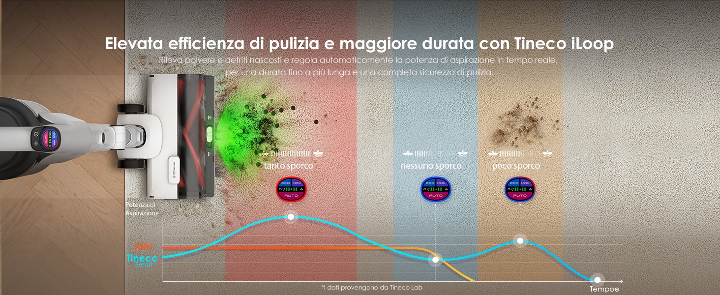 Ottima, come sempre, l’autonomia, grazie alla tecnologia proprietaria iLoop che rileva la quantità di sporco e regola di conseguenza la potenza di aspirazione, con qualsiasi accessorio montato. In questo modo i consumi sono particolarmente ottimizzati e l’autonomia complessiva può raggiungere facilmente i 70 minuti, un risultato davvero molto apprezzabile che permette di pulire abitazioni di ampie dimensioni senza dover ricorrere a ricarica aggiuntive.