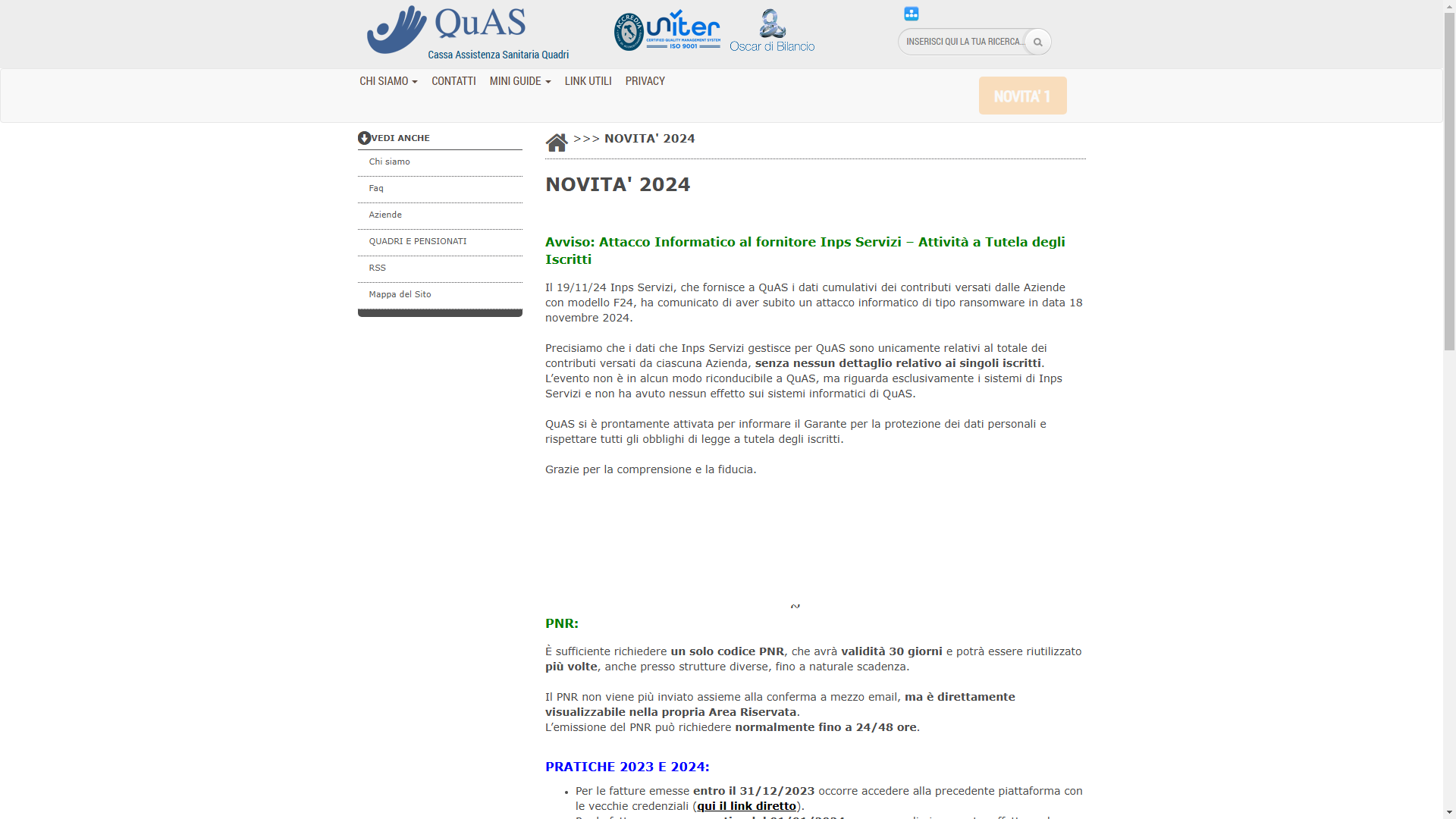 Solo il giorno dopo, l’azienda (controllata dall’INPS), ha comunicato il data breach ai fornitori. Ad esempio, il portale del QuAS (Cassa Asssistenza Sanitaria Quadri) mostra ancora oggi un pop-up che avvisa dell’accaduto.