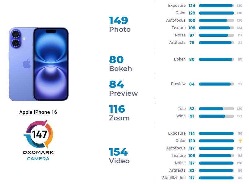 La fotocamera dell’iPhone 16 ha totalizzato complessivamente 147 punti che lo posizionano al 20° posto nella classifica globale degli smartphone appena dopo Google Pixel 8 e alla pari con Pixel 7 Pro e HONOR Magic4 Ultimate.