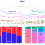 Molto meno ricercati i film, con una media di 0,9 accessi al mese e un calo del 25% nel 2023, contenuti anch’essi trasmessi tramite soprattutto in streaming (per il 74% del totale) e in parte tramite download. Il mezzo più utilizzato è anche qui il computer che supera, seppur di poco, i dispositivi mobili. Questione eventi in diretta, sia sportivi che non, è stata rilevata una crescita dal 2021 al 2023, anno che si è chiuso con una media europea di 0,53 accessi al mese, soprattutto dal computer.