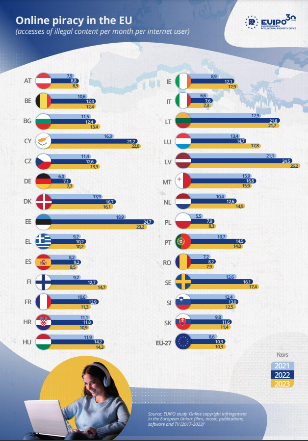 Come anticipato, il nostro è il paese in cui la pirateria digitale è meno diffusa secondo il rapporto dell’EUIPO. Con 7,3 accessi mensili l’Italia registra il numero più basso di visite nel 2023 nell’Unione Europea, seguita dalla Germania con 7,7 e dalla Romania con 7,9. Sono inferiori alla media europea (10,3) anche l’Austria (8,9), la Spagna (8,5) e la Polonia (8,3). Chi fa peggio è invece la Lettonia, con 26,2 accessi mensili, preceduta dall’Estonia (23,2) e dalla Lituania (21,7). Nell’immagine che segue ci sono tutte le altre, con anche le medie dei due anni precedenti, 2022 e 2021.