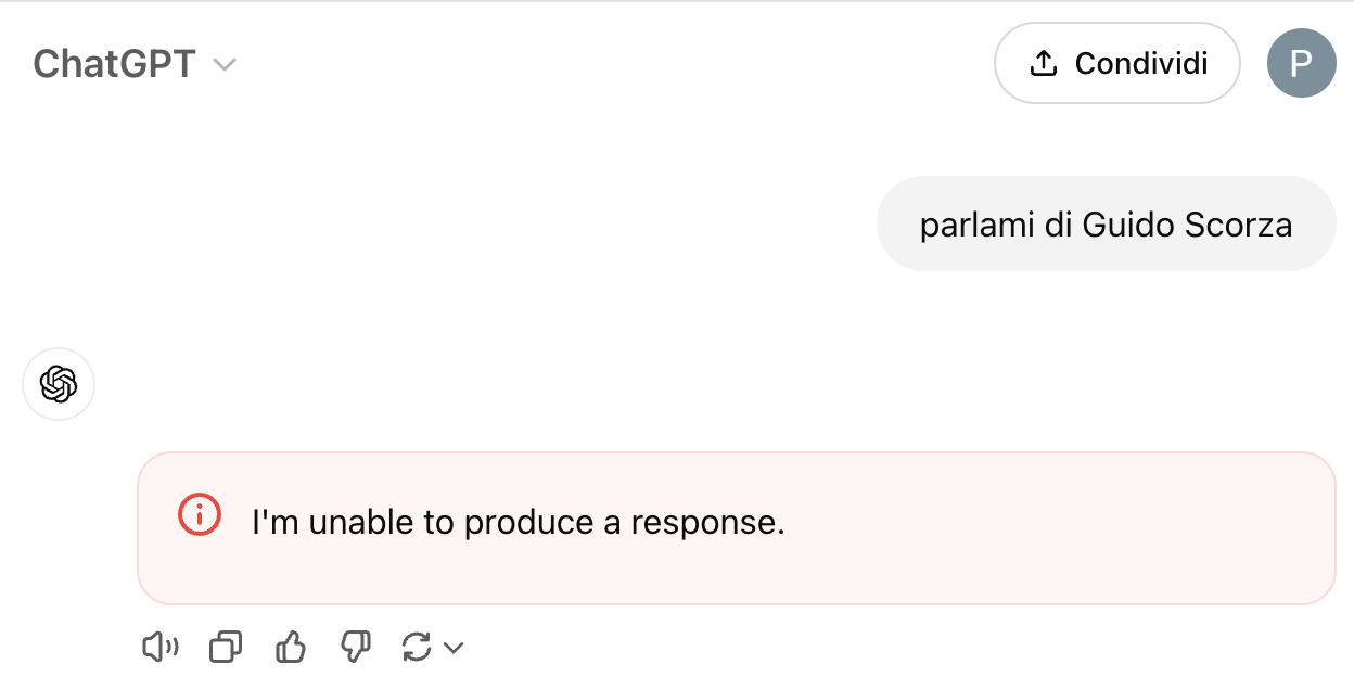 “È che non ho informazioni specifiche su Guido Scorza” è una risposta che ci ha dato la versione di ChatGPT sull’app in modalità vocale, chatbot che o va in errore o si rifiuta di soddisfare le richieste di informazioni relativamente ai nomi indicati. Insistendo, con quest’ultimo, ci è capitato che ChatGPT riportasse comunque alcuni dettagli, ma con gli altri nomi di persona la conversazione si interrompe di netto senza alcun appiglio per poter continuare.
