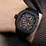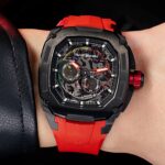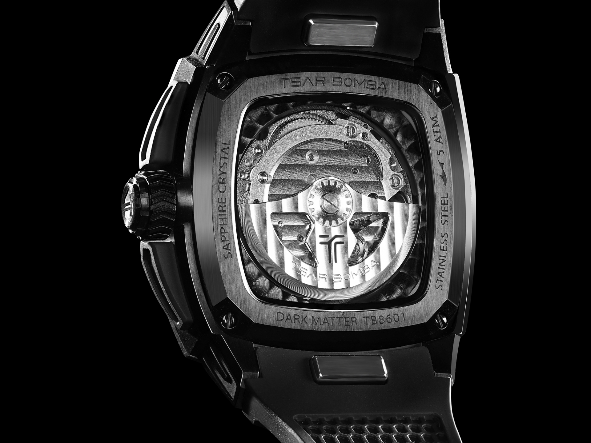 Tsar Bomba ha utilizzato il vetro zaffiro anche nella parte posteriore, così da permettere di visualizzare i meccanismo all’interno dell’orologio, andando a completare la visione frontale. Il quadrante offre infatti una spettacolare vista su ingranaggi, rotelle e viti che regolano il funzionamento dell’orologio, che ovviamente ha una ricarica automatica con il movimento del polso, soluzione tipica degli orologi di una certa qualità.