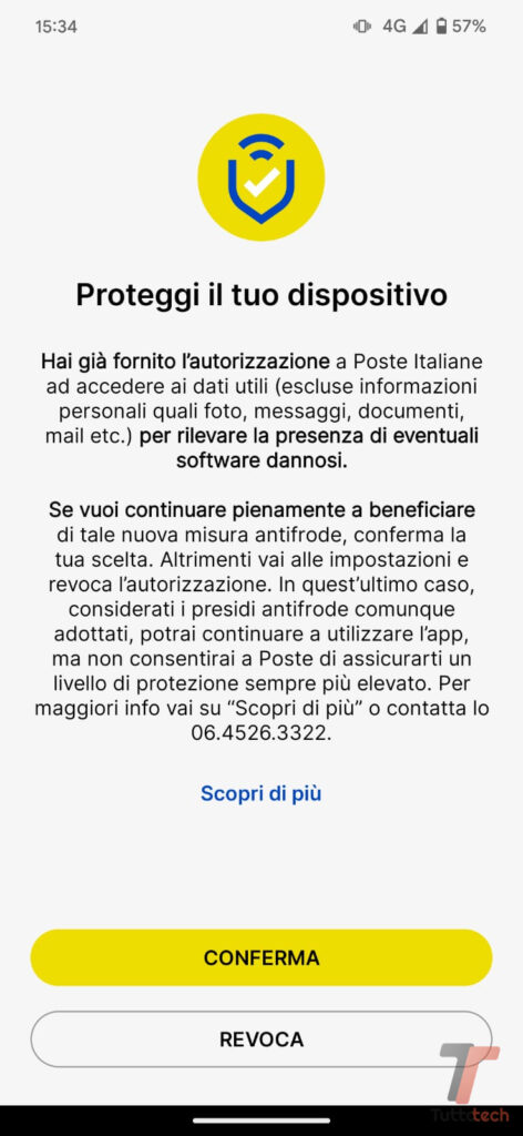 Se vuoi continuare pienamente a beneficiare di tale nuova misura antifrode, conferma la tua scelta. Altrimenti vai alle impostazioni e revoca l’autorizzazione. In quest’ultimo caso, considerati i presidi antifrode comunque adottati, potrai continuare a utilizzare l’app, ma non consentirai a Poste di assicurarti un livello di protezione sempre più elevato.