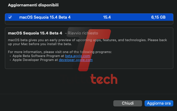 Stando alla classificazione della stabilità della build, passiamo da una classificazione “f” a una classificazione “a”: alla pari della nuova build per iOS e iPadOS, anche in questo caso viene raggiunta la piena stabilità (almeno sulla carta) ma non è ancora stata raggiunta la piena stabilità. Segnaliamo che l’aggiornamento che porta con sé questa beta 4 ha un peso di 6,15 GB su MacBook Pro 16 M1 Pro (provenendo da macOS 15.3.2 Sequoia).