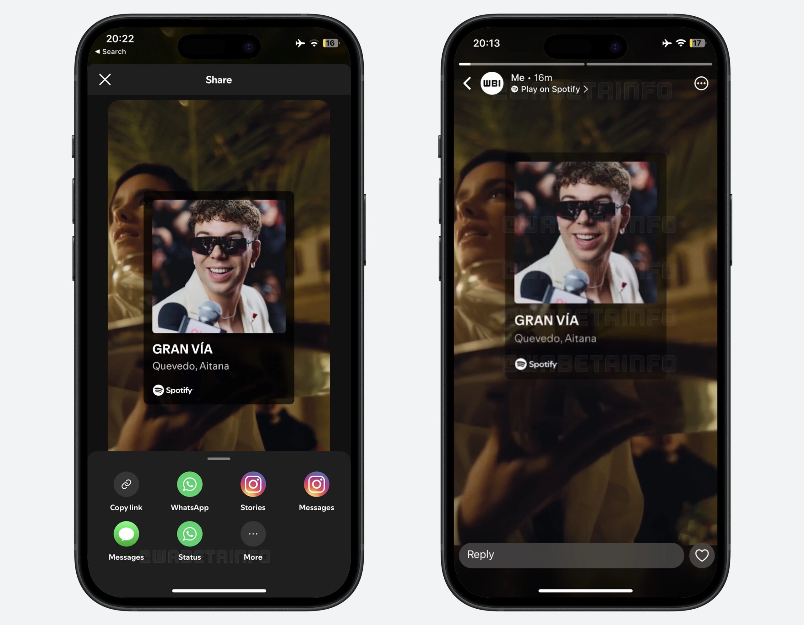Grazie a questo aggiornamento (le cui tempistiche di rilascio sono ancora ignote) l’applicazione proporrà, di fatto, un’interfaccia di condivisione dei brani mutuata da Instagram; le scelte di UI sono pressoché identiche (anche per dare un senso di familiarità agli utenti e di continuità tra le varie app di proprietà di Meta).