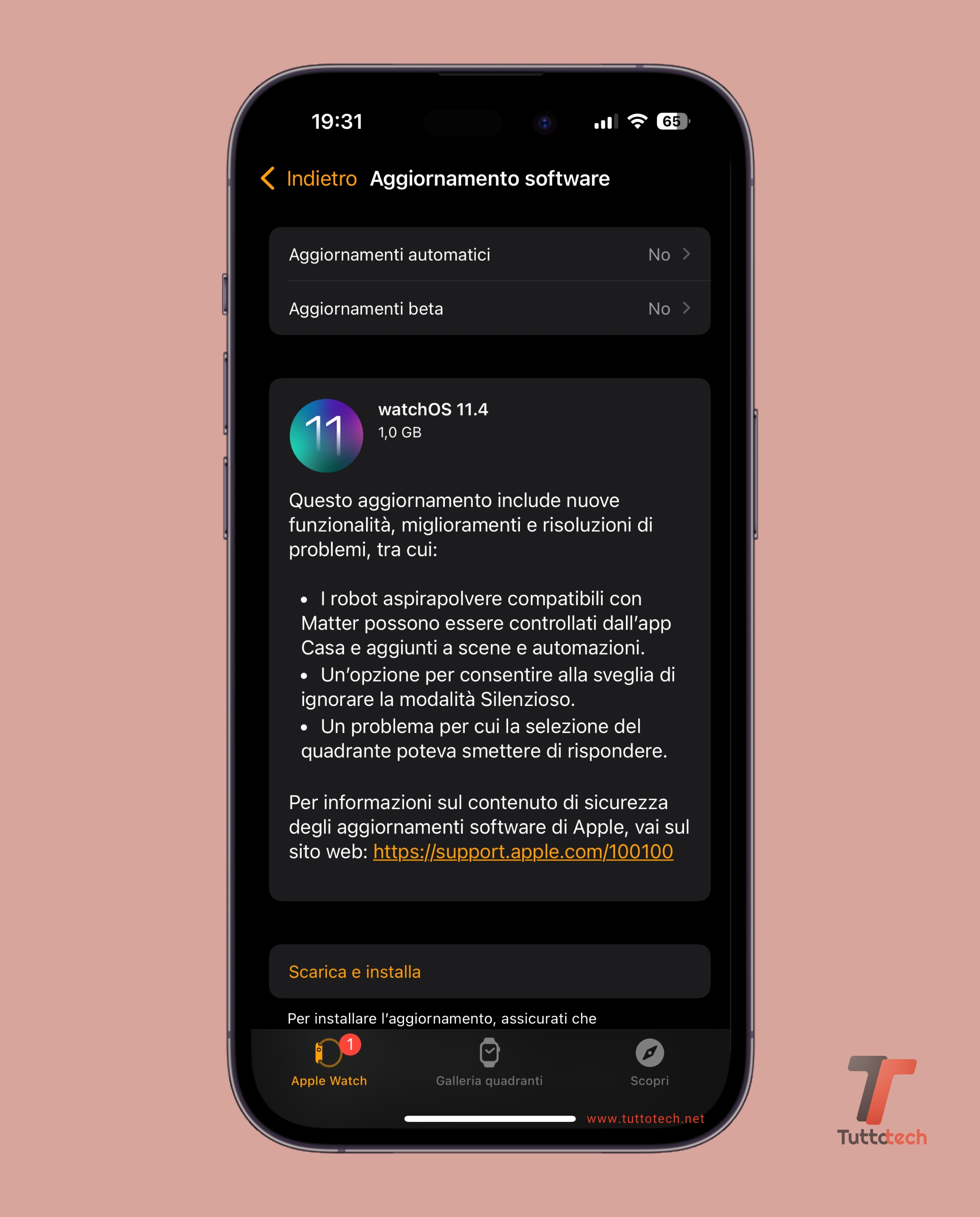 - Per aggiornare Apple Watch è sufficiente aprire l’app Watch presente sul proprio iPhone e seguire il percorso “Generali > Aggiornamento software” e selezionare “Scarica e installa” quando verrà rilevata la presenza del nuovo aggiornamento; per procedere, iPhone e Apple Watch dovranno rimanere nel raggio di portata della connessione, mentre lo smartwatch dovrà avere almeno il 50% di carica ed essere mantenuto in carica. Per potere installare watchOS 11.4, l’app Watch richiede che sull’iPhone associato sia stato effettuato l’aggiornamento ad iOS 18.4.