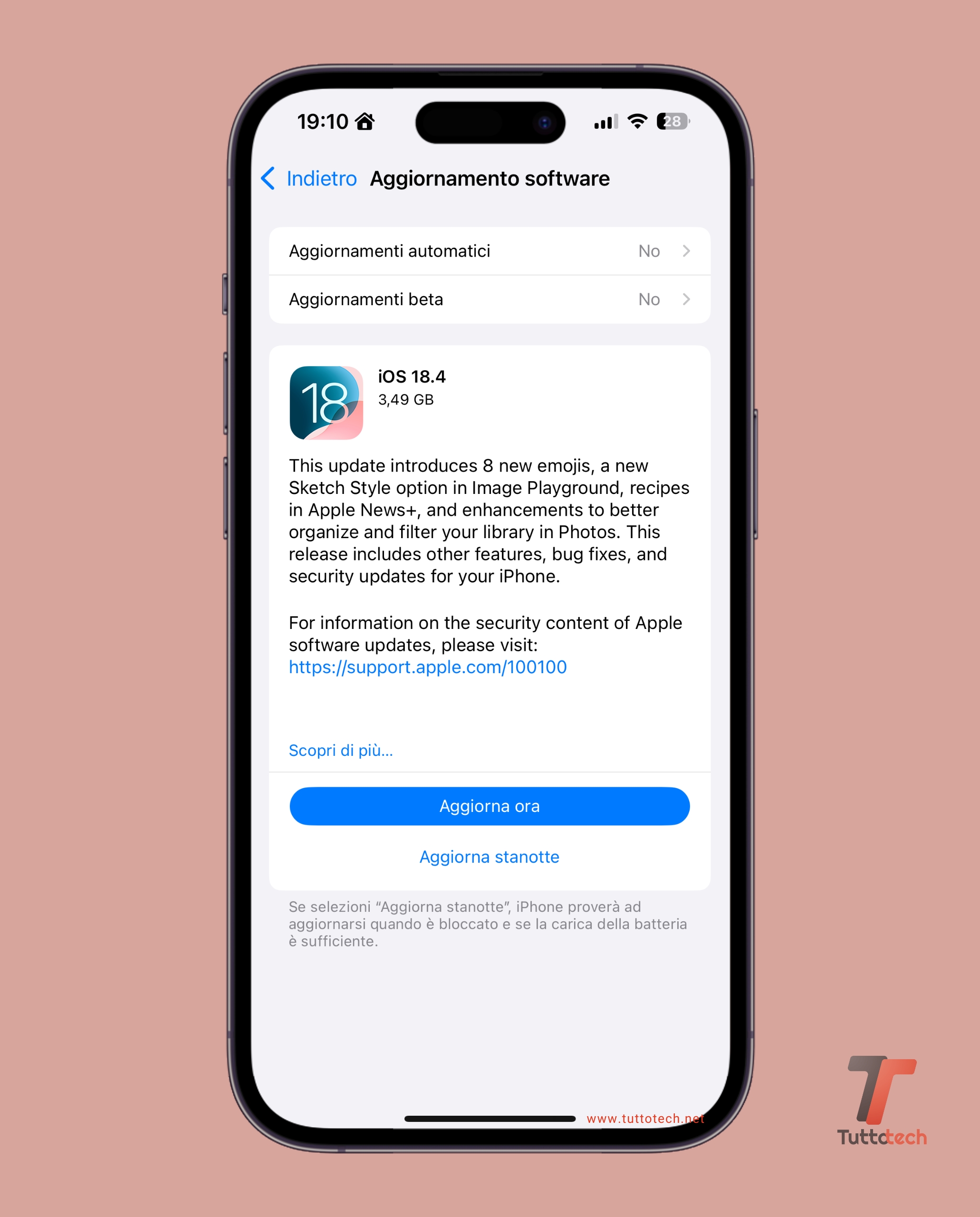 Per aggiornare iPhone a iOS 18.4 è sufficiente seguire il percorso “Impostazioni > Generali > Aggiornamento Software”, ed effettuare un tap su “Aggiorna ora”. È necessario che l’iPhone abbia almeno il 50% di carica residua o che abbia almeno il 20% di carica residua e sia collegato al caricabatterie. La stessa procedura vale per l’aggiornamento a iPadOS 18.4 sugli iPad.
