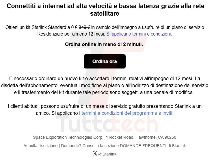 Una sorta di penale nascosta, che di fatto annulla il vantaggio iniziale se non si rispettano le condizioni per tutti e 12 i mesi. Va anche detto che, al momento, questa tassa è espressamente indicata nei siti Starlink di altri Paesi, ma non ancora nella sezione italiana; tuttavia, la promozione ricevuta via email in Italia lascia intendere che le stesse clausole si applichino anche da noi, quindi è consigliabile muoversi con prudenza.