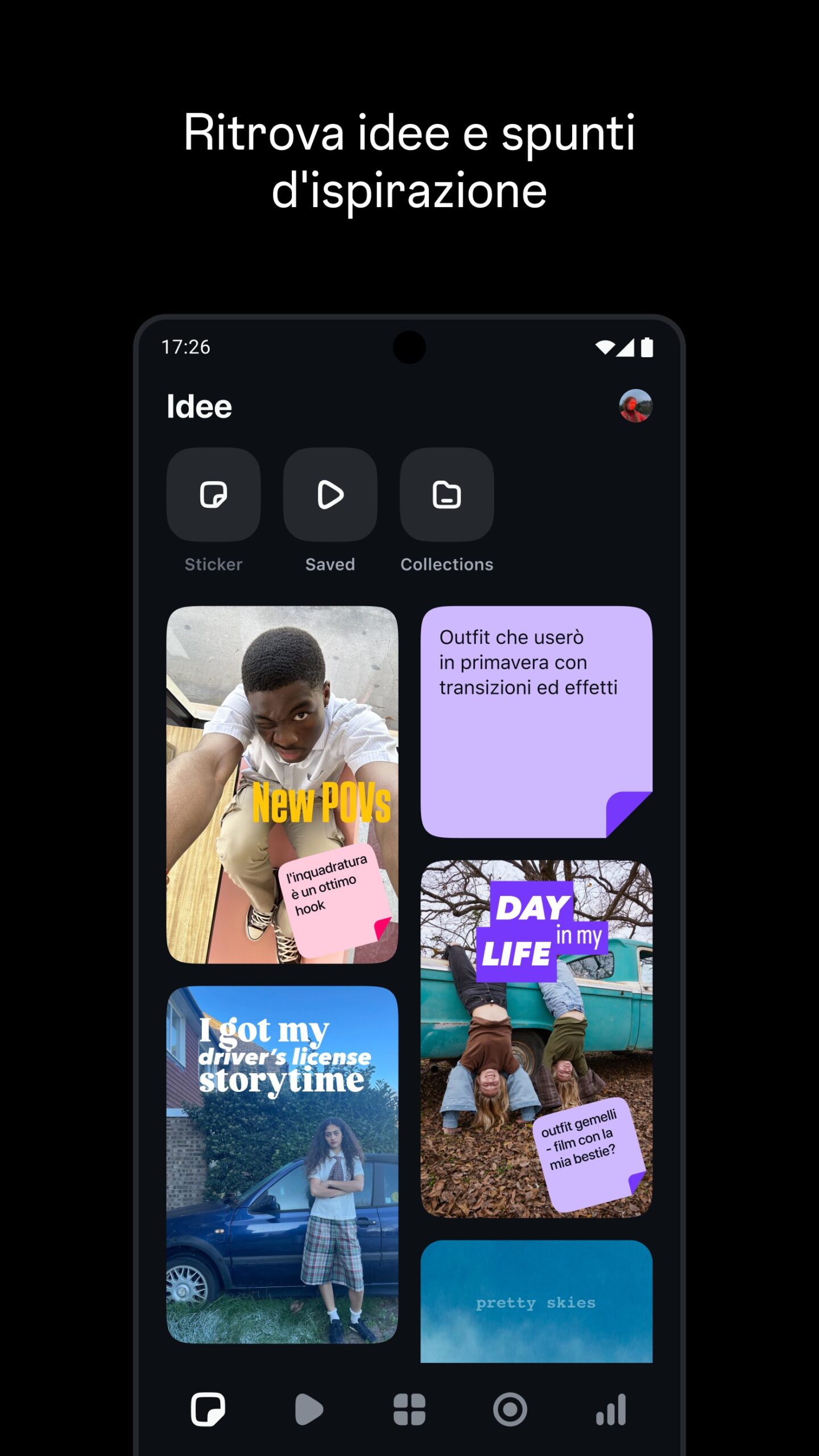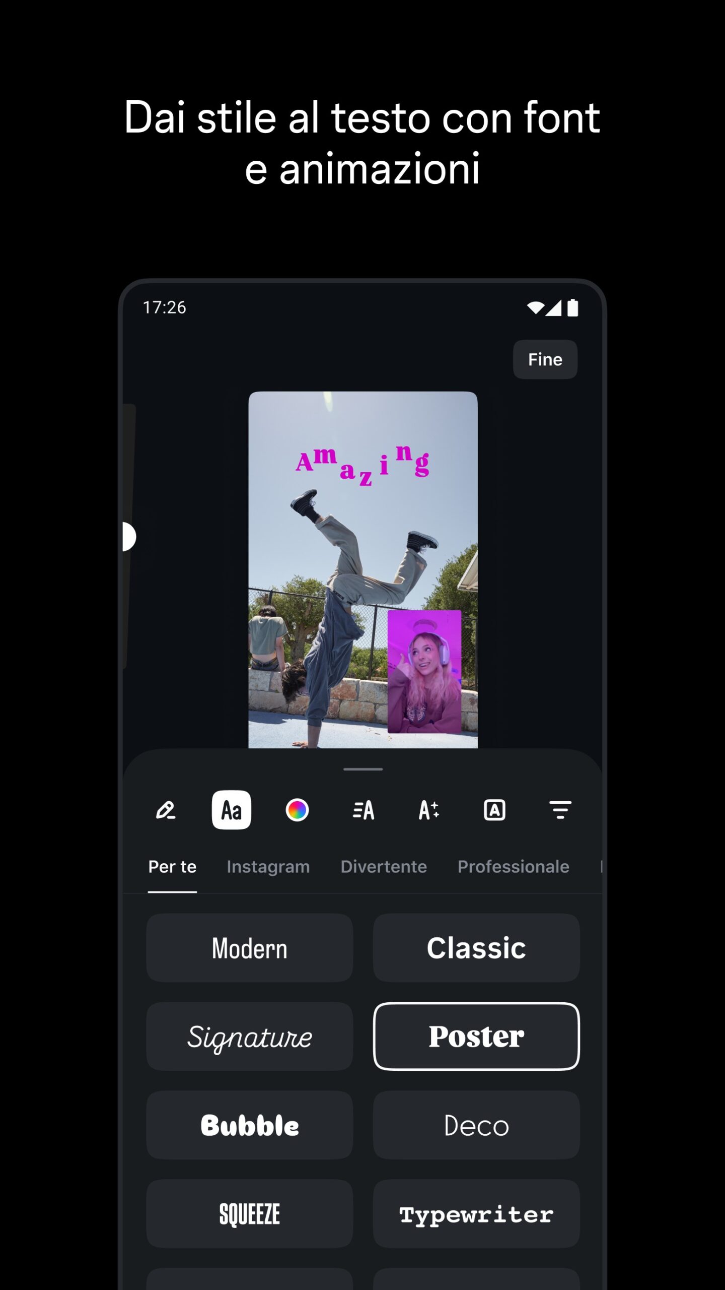 Una volta effettuato l’accesso con il proprio account Instagram, l’interfaccia principale si apre su una home che consente di caricare clip video o foto già presenti nella galleria, oppure di registrarne di nuove direttamente dall’app, con una durata massima di 10 minuti. L’editor permette di: