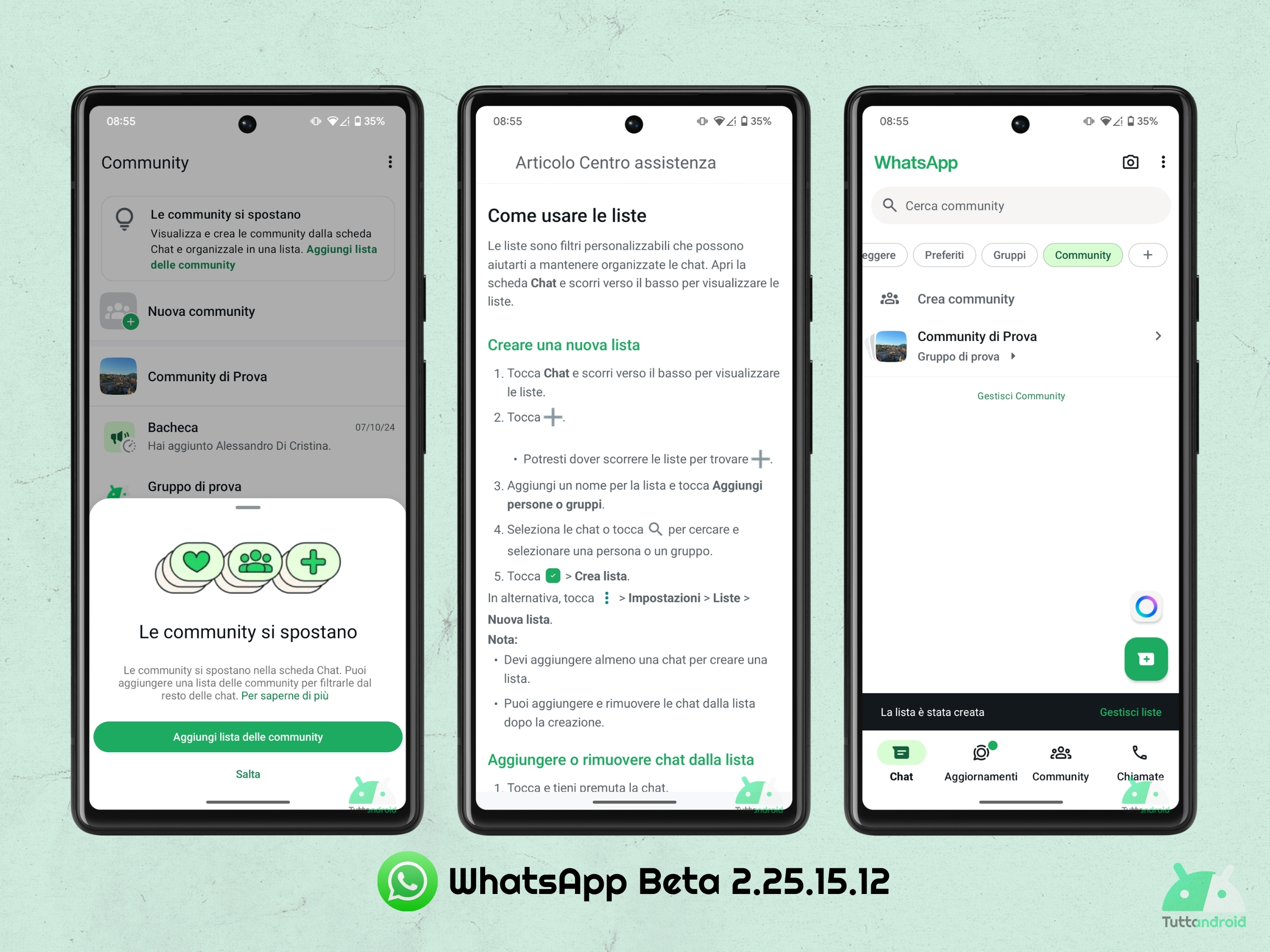 Effettuando un tap su “Per saperne di più”, siamo stati rimandati a un articolo del centro assistenza che spiega come usare le liste di WhatsApp. Nonostante l’avviso, la scheda Community continua a sopravvivere, almeno per il momento, ma in futuro verrà eliminata: a quel punto, le community saranno accessibili (e gestibili) solo attraverso la lista dedicata nella scheda Chat.