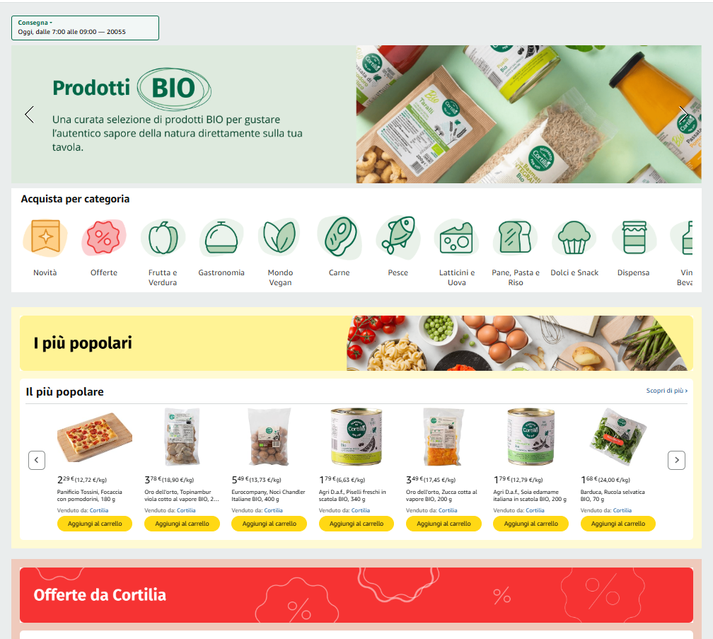 Da oggi, 20 maggio 2025, i clienti Amazon di Milano, Monza e delle aree limitrofe possono scoprire e acquistare il necessario per la propria spesa giornaliera all’interno del nuovo store di Cortilia. Il servizio, raggiungibile a questo link, sarà proposto nei prossimi mesi anche per i clienti di Torino, Genova, Bologna e aree limitrofe, per poi essere progressivamente allargato ad altre località della penisola.