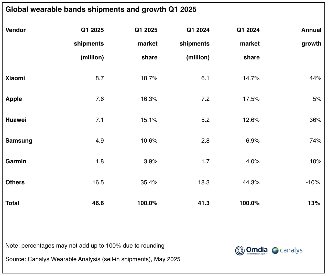 Un nuovo report fotografa l’andamento del mercato dei wearable nel primo trimestre del 2025, evidenziando una crescita complessiva degna di nota e analizzando i risultati conseguiti dai principali player del mercato: Xiaomi svetta su tutti, ma Apple rimane forte e Huawei e Samsung registrano crescite ragguardevoli.