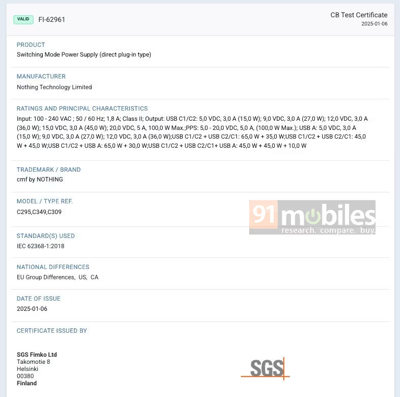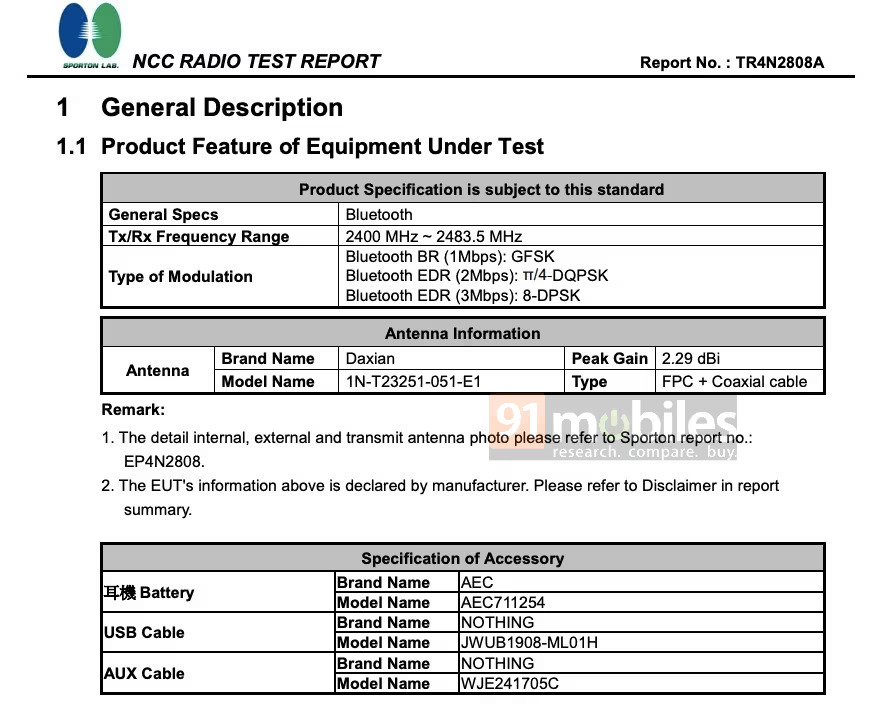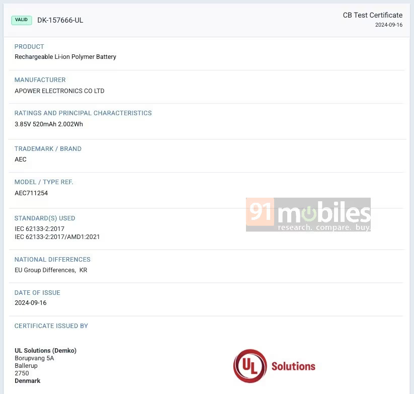 Le Nothing Headphone (1) hanno fatto capolino anche sul sito della danese UL Demko, che svela che le cuffie sono dotate di una batteria da 520 mAh — con model number AEC711254 — e certifica la sicurezza del prodotto per la commercializzazione nell’Unione europea. Come si accennava, le prime cuffie over ear di Nothing sono apparse anche nel database della SGS Fimko, che riporta il supporto alla ricarica a 5 watt.