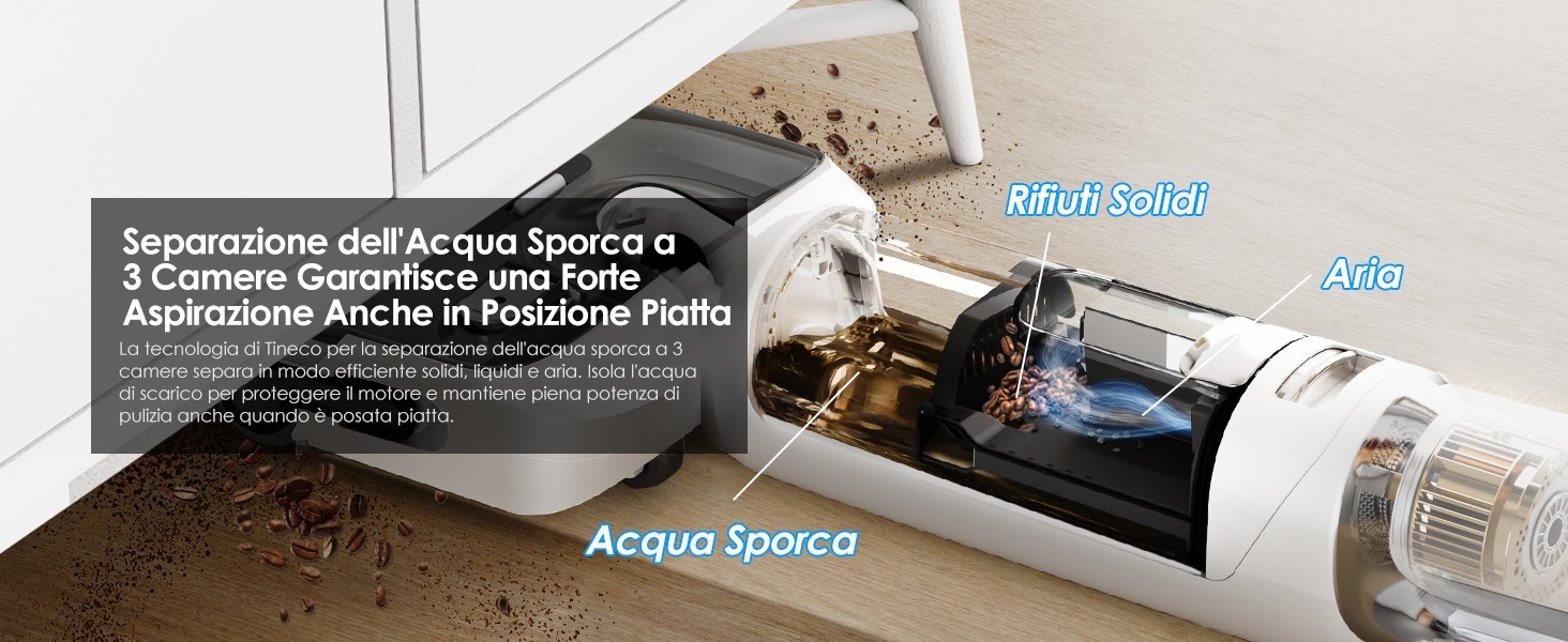 Tineco FLOOR ONE STRETCH S6 si è distinta come la primo lavapavimenti della casa produttrice asiatica a introdurre la capacità di inclinare il corpo macchina fino a 180 gradi. Questa caratteristica rivoluzionaria consente di pulire agevolmente anche sotto mobili, letti e divani, a condizione che vi siano almeno 13 centimetri di altezza per il passaggio dell’apparecchio. La tecnologia impiegata da Tineco prevede un sistema a tre camere per la separazione dei liquidi di scarto, che isola efficacemente l’acqua sporca, i detriti solidi e l’aria. Questo accorgimento protegge il motore e assicura che la massima forza aspirante sia mantenuta anche quando il dispositivo è completamente reclinato.