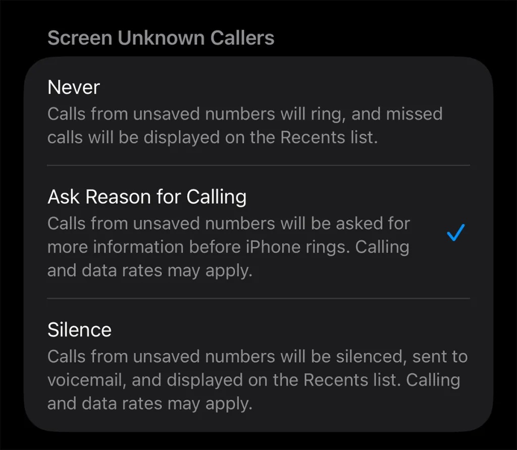 L’opzione di filtraggio “Screen Unknown Callers” (filtra chiamanti sconosciuti) guadagna una nuova opzione chiamata Silenzia (le chiamate provenienti da numeri sconosciuti nverranno silenziate, inviate alla segreteria telefonica ma saranno presenti nella cronologia delle chiamate recenti).