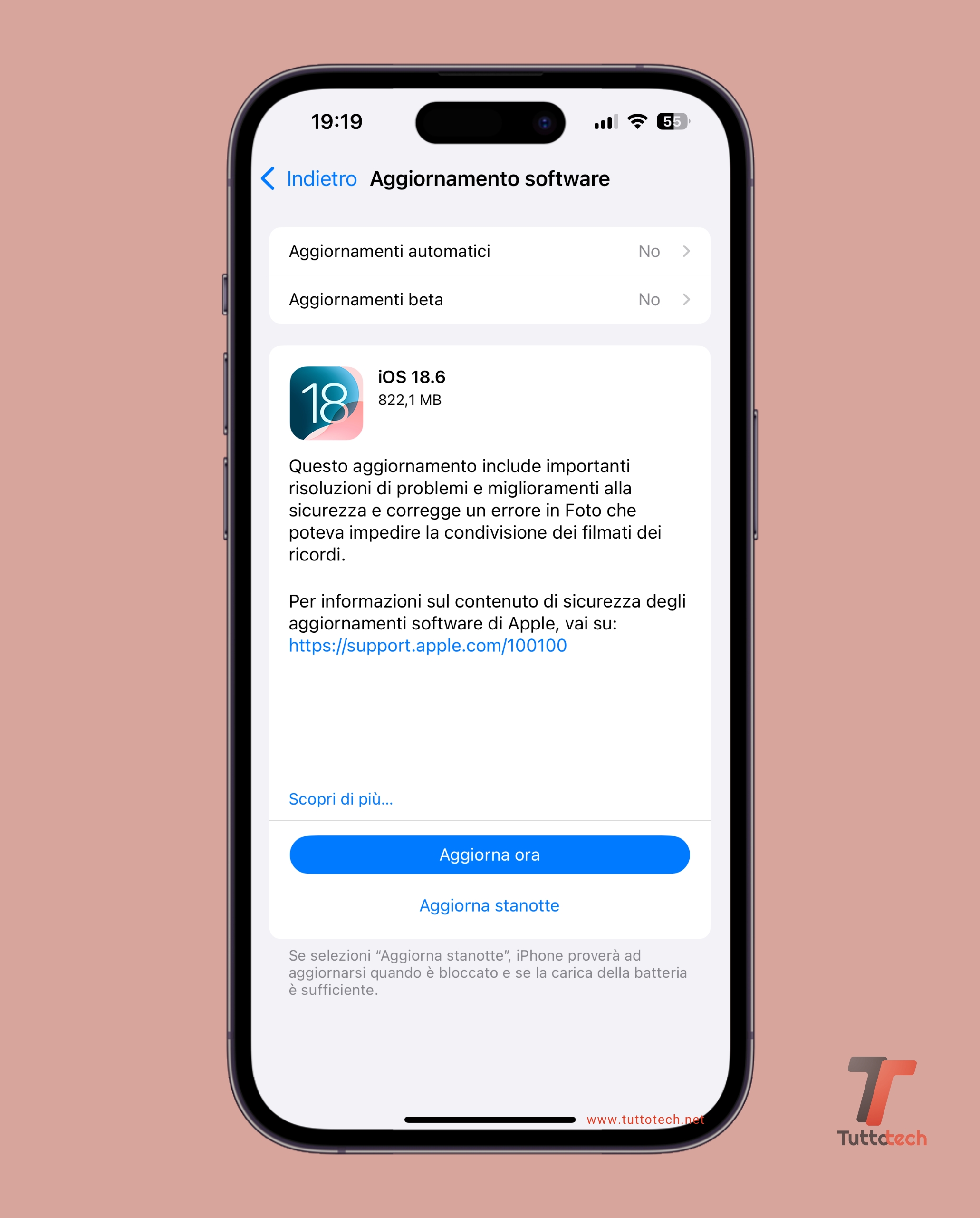 Per aggiornare iPhone a iOS 18.6 è sufficiente seguire il percorso “Impostazioni > Generali > Aggiornamento Software”, ed effettuare un tap su “Aggiorna ora”. È necessario che l’iPhone abbia almeno il 50% di carica residua o che abbia almeno il 20% di carica residua e sia collegato al caricabatterie. La stessa procedura vale per l’aggiornamento a iPadOS 18.6 sugli iPad.