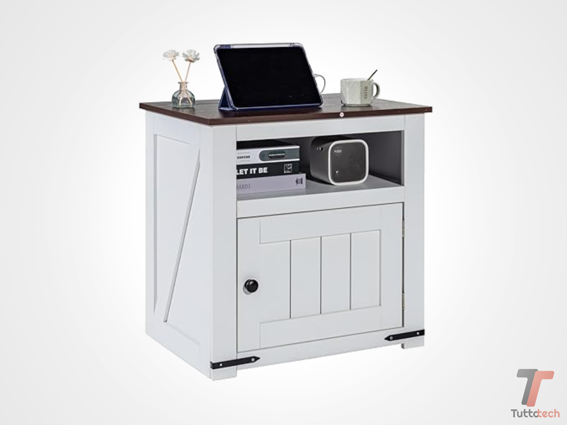 Questa dotazione elimina la necessità di ciabatte e grovigli di cavi, mantenendo l’ordine e la funzionalità. Dal punto di vista strutturale, il tavolino offre un’eccellente organizzazione dello spazio grazie ai suoi tre ripiani. Con dimensioni di 610 x 457 x 608 mm, fornisce ampio spazio per libri, riviste, telecomandi o oggetti decorativi. Lo stile fattoria, con la sua finitura bianca e le linee pulite, si adatta con versatilità a diversi contesti, dal soggiorno alla camera da letto, passando per l’ufficio. Realizzato in truciolato e pannelli di densità, garantisce una buona stabilità per l’uso quotidiano.