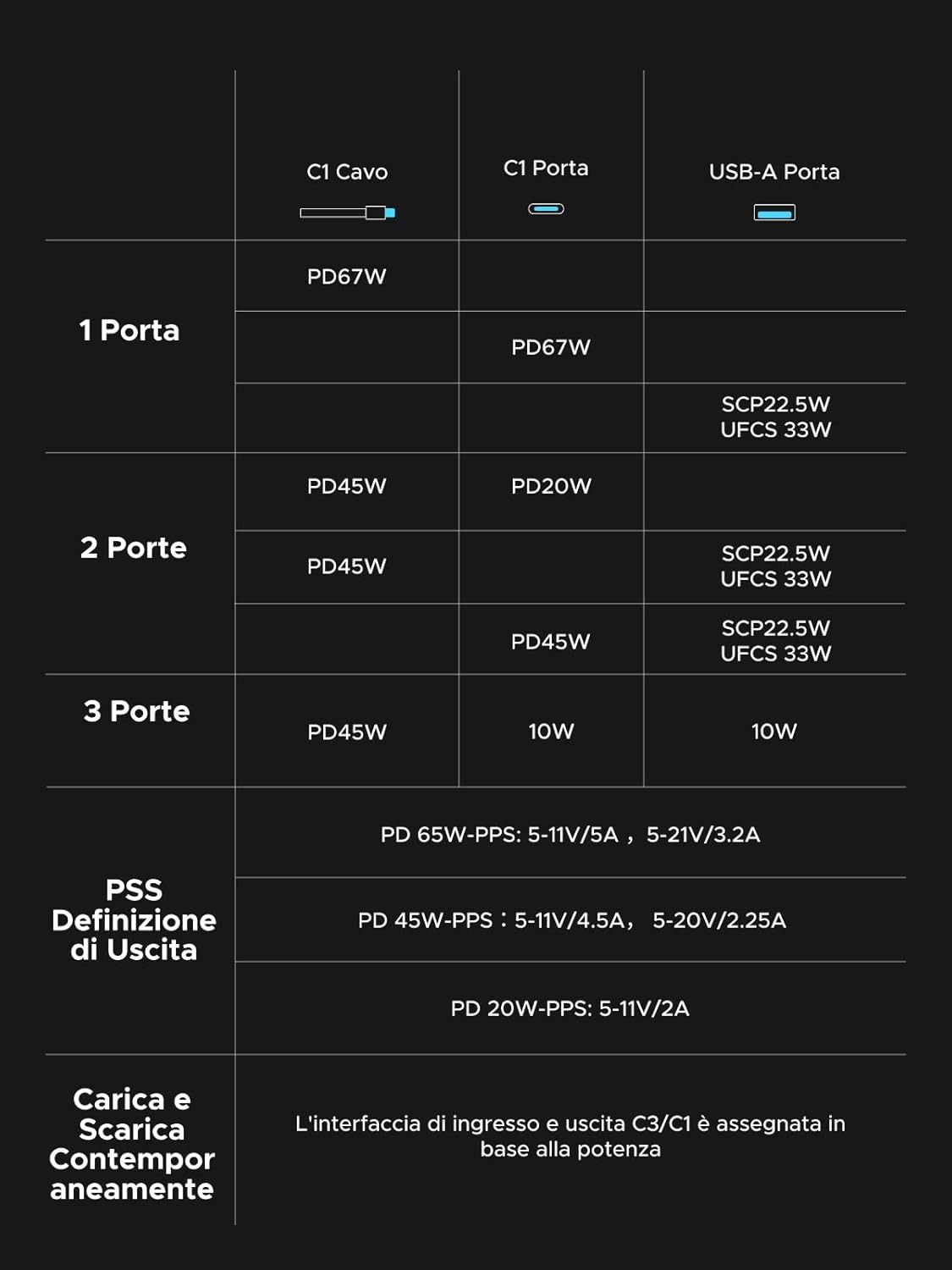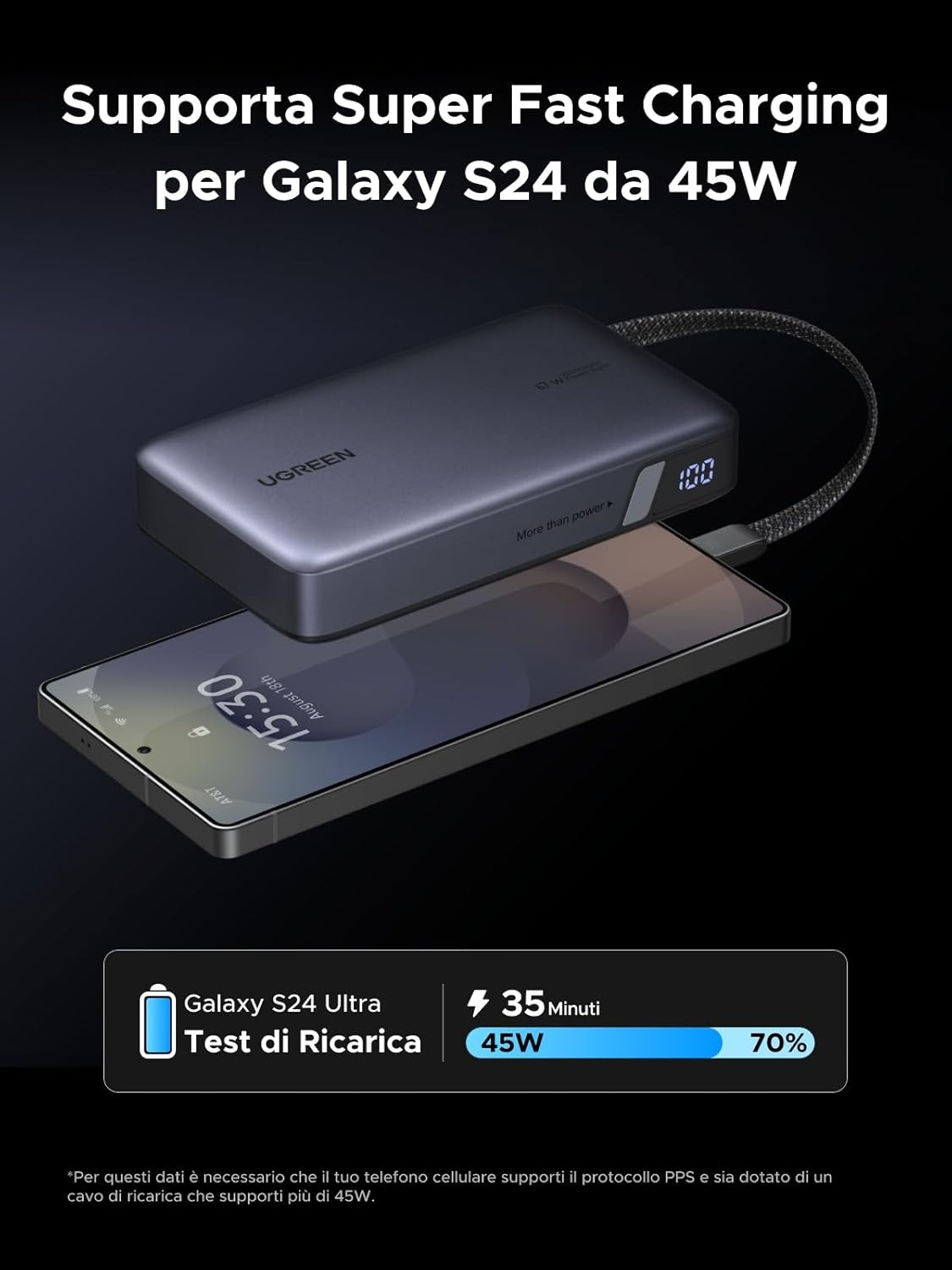Il punto forte di questo accessorio è la capacità di offrire fino a 67 W di potenza in uscita, sfruttando sia la porta USB-C principale che il cavo fisso; lato pratico ciò significa che, secondo i dati ufficiali, è possibile ricaricare un Samsung Galaxy S24 Ultra al 70% in appena 35 minuti, utilizzando l’uscita a 45 W.