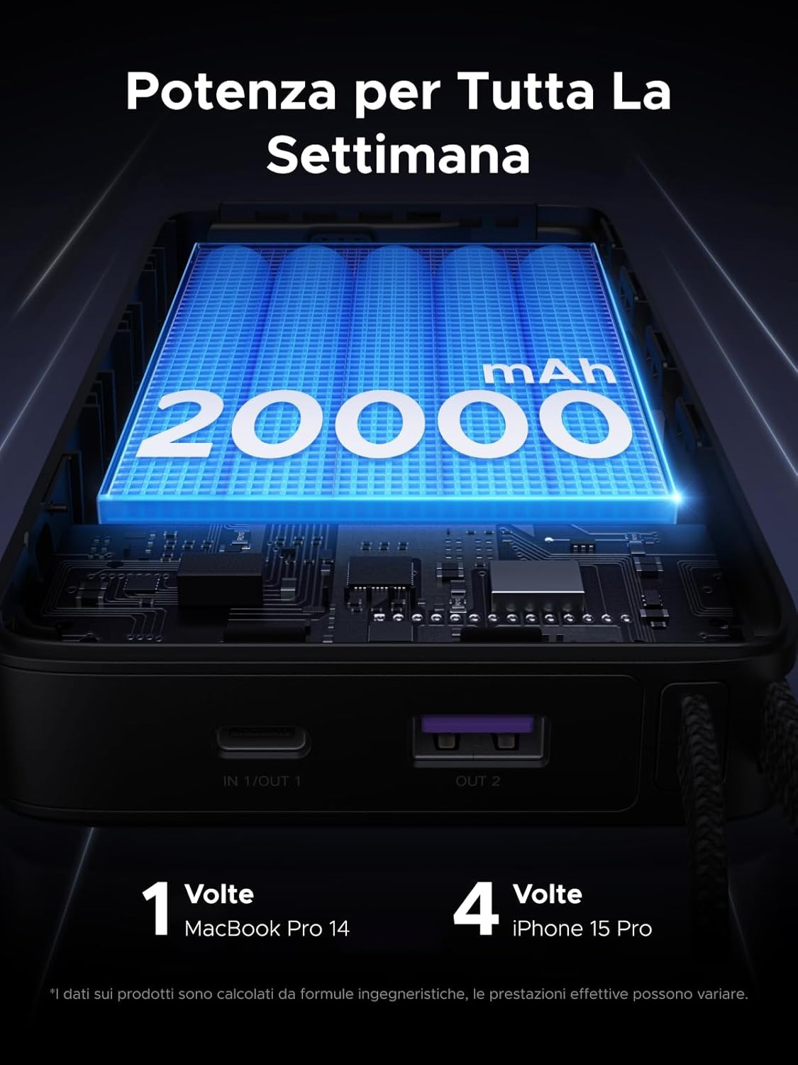 Altro dettaglio da non sottovalutare è la presenza di un display digitale laterale che indica in tempo reale la percentuale residua di carica, un’aggiunta sempre più comune ma ancora non scontata in questa fascia di prezzo; secondo UGREEN, con una carica completa da 20.000 mAh l’utente può ottenere fino a 17,4 ore aggiuntive di utilizzo su un MacBook Air, rendendolo un compagno ideale anche per sessioni di lavoro prolungate fuori casa.