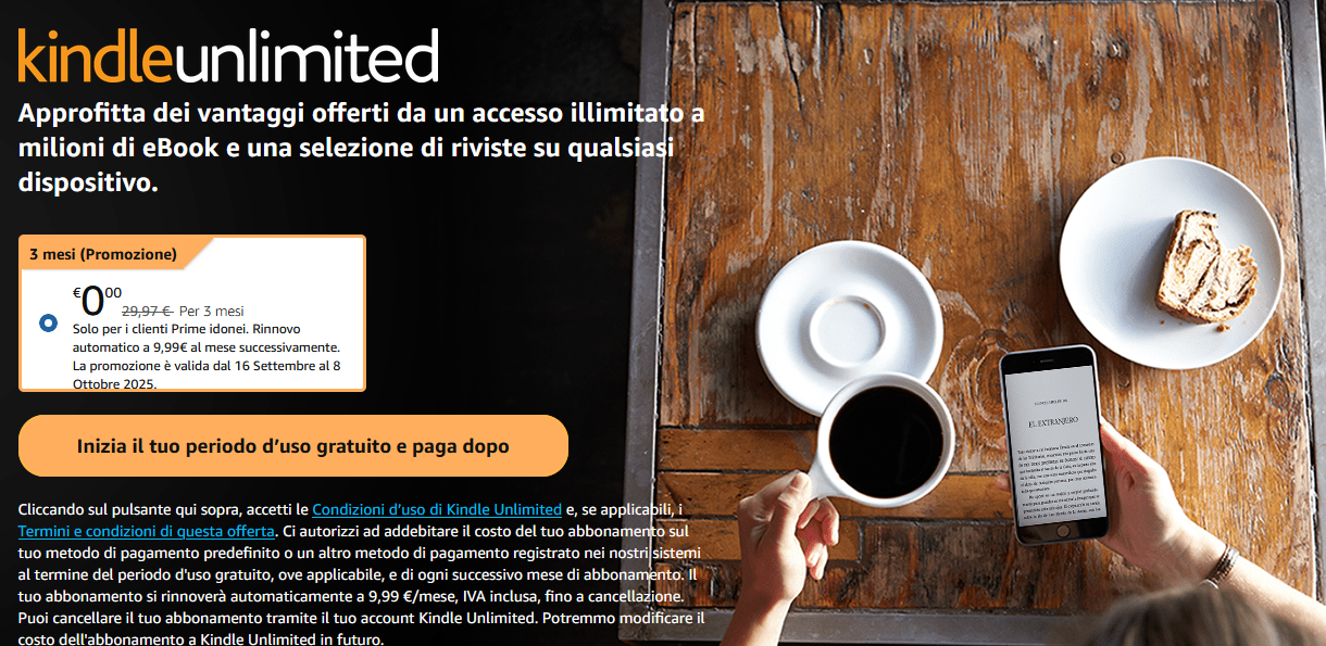 L’offerta è valida da oggi, 16 settembre, fino all’8 ottobre 2025 (cioè l’ultimo giorno della Festa delle Offerte Prime), e riguarda solo i clienti Prime idonei. Dopo i tre mesi di abbonamento gratuito a Kindle Unlimited, il rinnovo avviene automaticamente a 9,99 euro al mese, a meno di disattivazione. Come probabilmente saprete, Kindle Unlimited è un servizio che offre letture illimitate a milioni di eBook e l’accesso a un’ampia selezione di riviste, fruibili da qualsiasi dispositivo, sia Kindle che non (direttamente con l’app Kindle anche su smartphone e tablet, sia Android che iOS/iPadOS).
