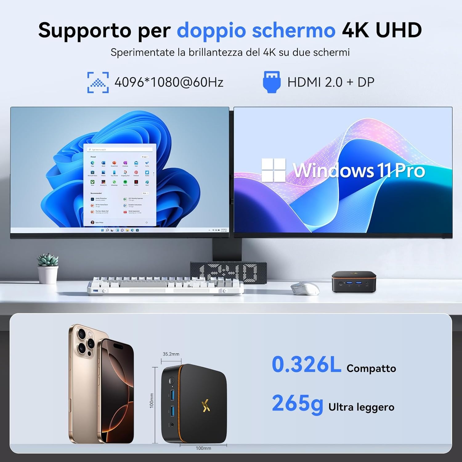 Nonostante le dimensioni ridotte, Huidun H50 può pilotare due display 4K a 60 Hz grazie a una porta HDMI e una porta DisplayPort, perfette per multitasking, editing leggero o postazioni di lavoro multischermo.