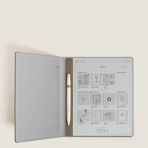 Dotato di uno schermo monocromatico con tecnologia e-ink, il taccuino digitale di Montblanc permette di scrivere, disegnare e annotare documenti con una fluidità che vuole replicare l’esperienza analogica. L’utente può partire da una pagina bianca o modificare un PDF, salvando e condividendo gli appunti con semplicità. La vera firma stilistica arriva dalla Montblanc Digital Pen, ispirata al design iconico della penna Meisterstück. La penna integra un motore aptico, con una sensibilità alla pressione di oltre 4.000 livelli e punte intercambiabili (nella confezione ne sono presenti tre: lino, liscia e opaca) che permettono di personalizzare la sensazione della scrittura su superfici differenti.
