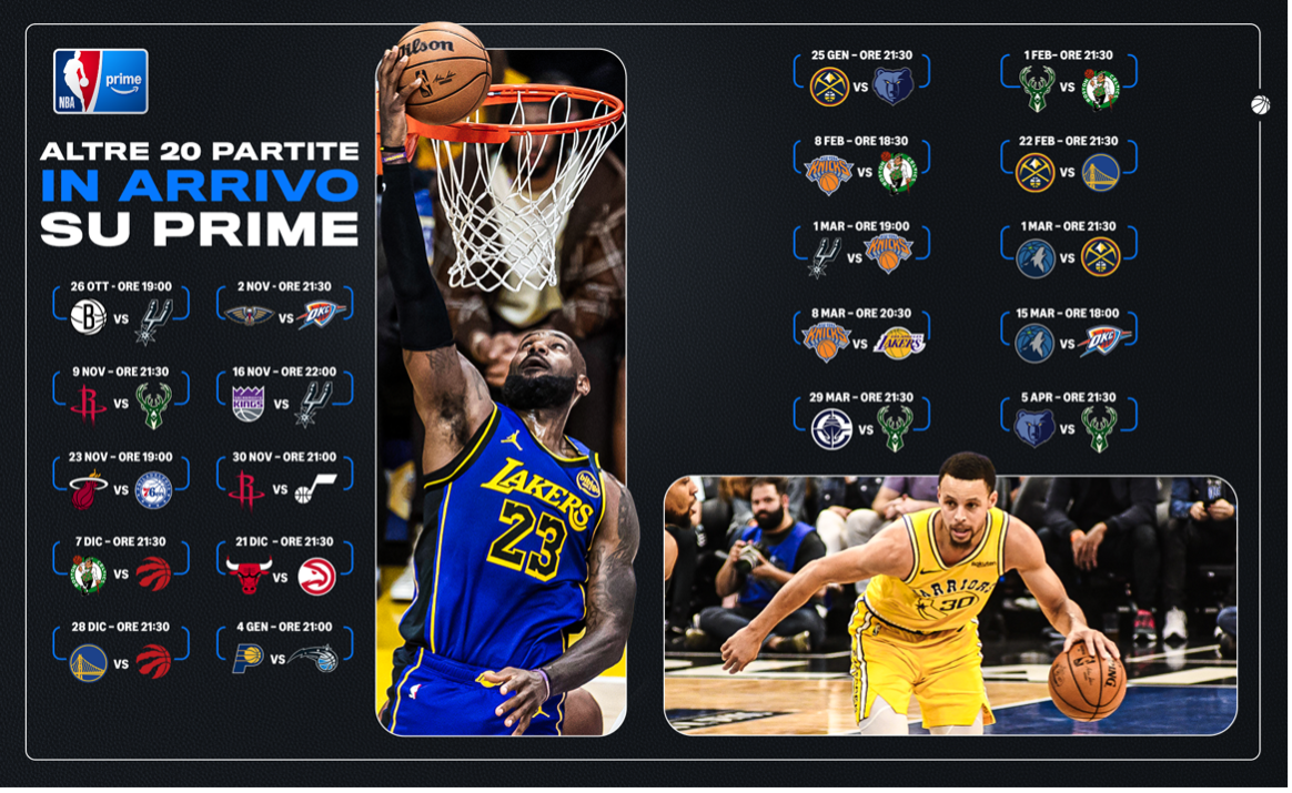Il calendario dell’esordio NBA su Prime Video è di primo livello; il debutto assoluto è previsto per la notte tra sabato 25 e domenica 26 ottobre con due partite in diretta, rematch degli scorsi Playoff NBA in cui a trionfare furono Knicks e Timberwolves a scapito delle due franchigie più iconiche della lega.
