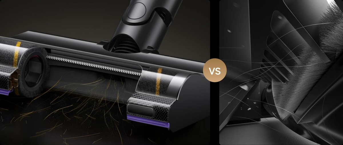 Nella confezione di vendita, decisamente ricca nel contenuto, sono presenti due spazzole motorizzate. Una oltre alla tecnologia GapFree e a un sistema a LED blu CelesTect frontale per illuminare il pavimento e scovare lo sporco, integra anche TangleCut un sistema con pettini e lame che tagliano peli e capelli raccolti, evitando la formazione di grovigli che dovrebbero poi essere rimossi dall’utente. Un’ottima soluzione indicata soprattutto i pavimenti duri, grazie alla spazzola a rullo morbida. La seconda spazzola invece dispone di setole a V ed è più rigida, pensata per destreggiarsi senza problemi su qualsiasi superficie, dalla moquette ai tappeti passando per i pavimenti più duri.