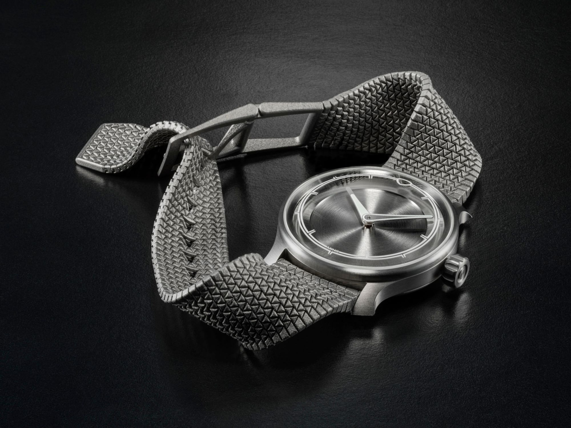 La fibbia ad ardiglione, anch’essa stampata in 3D, rappresenta un piccolo gioiello di microingegneria, articolata in un pezzo unico non richiede alcun assemblaggio manuale. L’unica eccezione è rappresentata dalle barrette a molla a sgancio rapido, necessarie per fissare il Polymesh alla cassa dell’orologio.