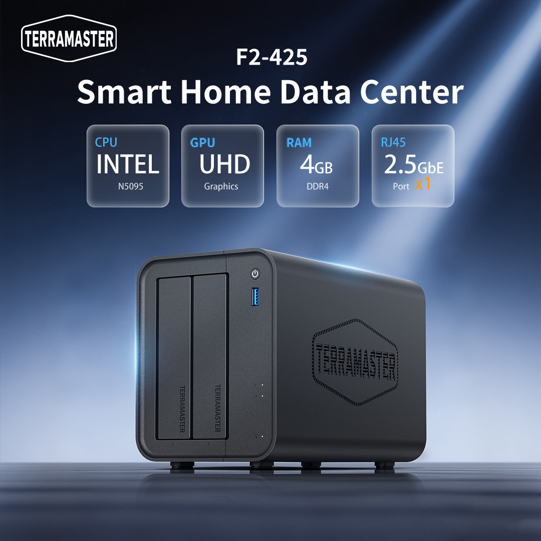 F2-425 è dotato di un processore Intel quad-core e di 4 GB di memoria DDR, grazie ai quali può gestire senza problemi la transcodifica 4K e il multitasking. In più, la porta 2,5 GbE garantisce trasferimenti di file ultraveloci e supporta l’accesso simultaneo multiutente. Non manca la decodifica 4K H.265 a livello hardware, così come la compatibilità con Plex, Emby e Jellyfin per una riproduzione video fluida e in alta definizione, e il supporto DLNA per uno streaming multi-dispositivo. Per le foto c’è l’album intelligente TerraPhotos AI, in grado di organizzare le immagini in modo efficiente.