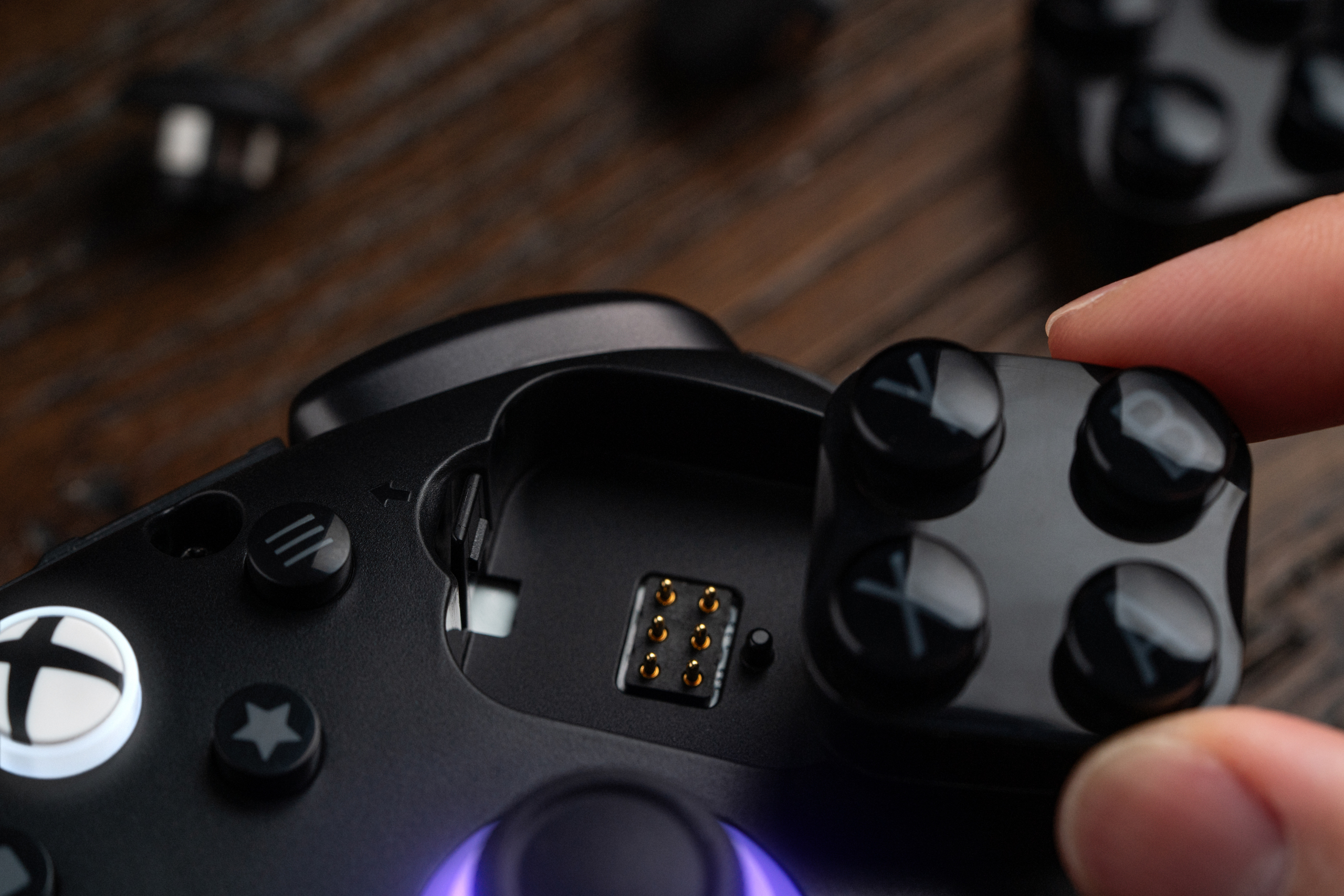 Il cuore del nuovo controller è la personalizzazione fisica. 8BitDo introduce moduli ABXY intercambiabili, permettendo di scegliere tra pulsanti in silicone oppure micro-switch, per passare da una pressione morbida a un feedback più tattile in pochi secondi. Anche D-pad e joystick sono sostituibili, con diverse opzioni incluse per adattarsi a giochi di guida, FPS o titoli fighting.