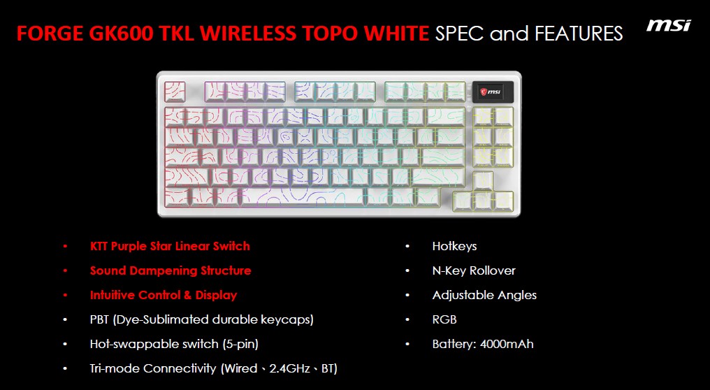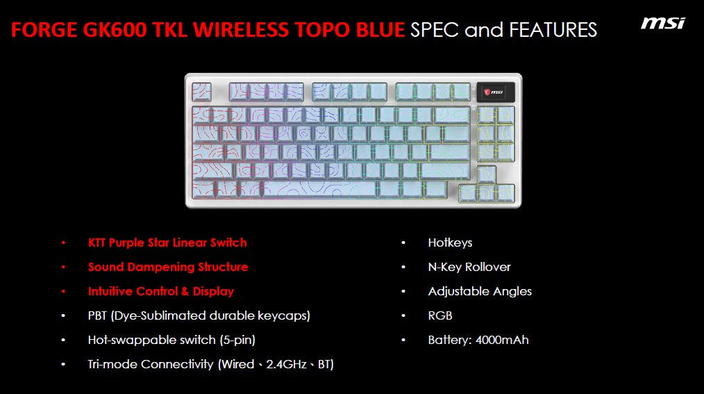La MSI FORGE GK600 TKL arriva anche in altre varianti a dir poco originali, tra queste: FORGE GK600 TKL WIRELESS MARS, FORGE GK600 TKL TOPO WHITE e FORGE GK600 TKL TOPO BLUE.