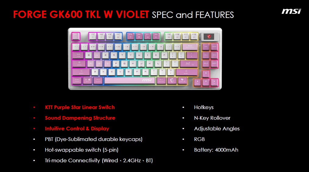Ma non finisce qui. MSI svela anche la FORGE GK600 TKL W SKY e Violet, compatte e a dir poco attraenti, non solo per l’estetica ma anche per quanto concerne qualità, rapidità e precisione. Entrambi i modelli supportano la tripla connettività cablata, wireless e Bluetooth, senza rinunciare a l’illuminazione RGB, switch hot-swappable e una batteria da 4.000 mAh.