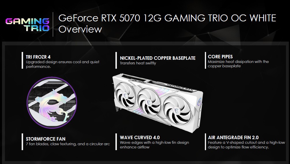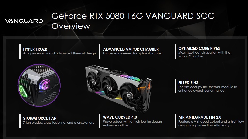 C’è posto anche per la GeForce RTX 5080 VANGUARD SOC che avevamo testato lo scorso anno, una novità della serie RTX 50, affiancata alla più nota GeForce RTX 5080 GAMING TRIO OC, disponibile anche in bianco ma con GPU GeForce RTX 5070 12 GB.