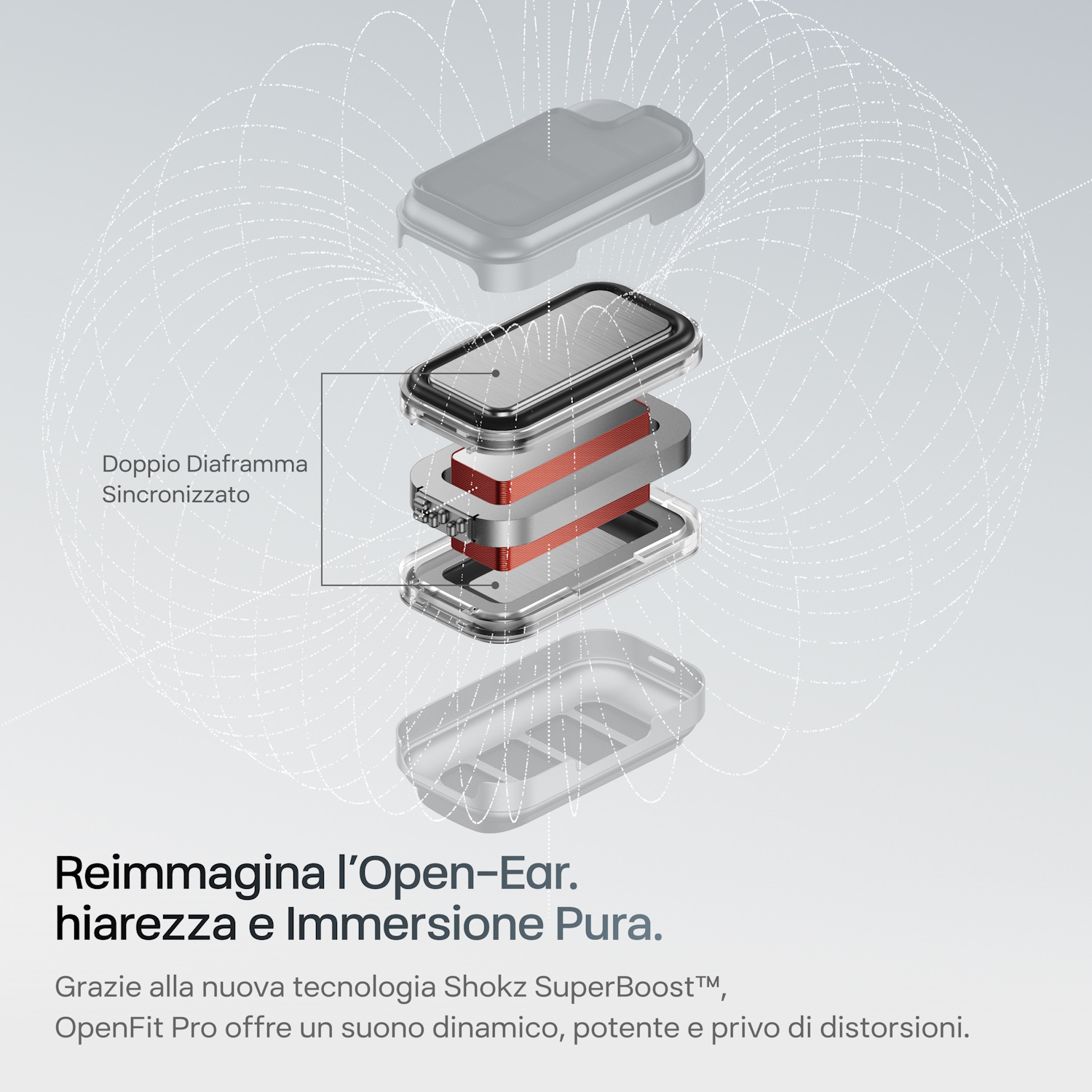 Le Shokz OpenFit Pro sfruttano la tecnologia esclusiva SuperBoost per offrire un suono potente, nitido e privo di distorsioni. Integrano un driver a doppia membrana sincronizzata, pensato per muovere i diaframmi in perfetta sintonia, con la promessa di restituire tutte le sfumature musicali attraverso alti cristallini e bassi profondi e definiti.