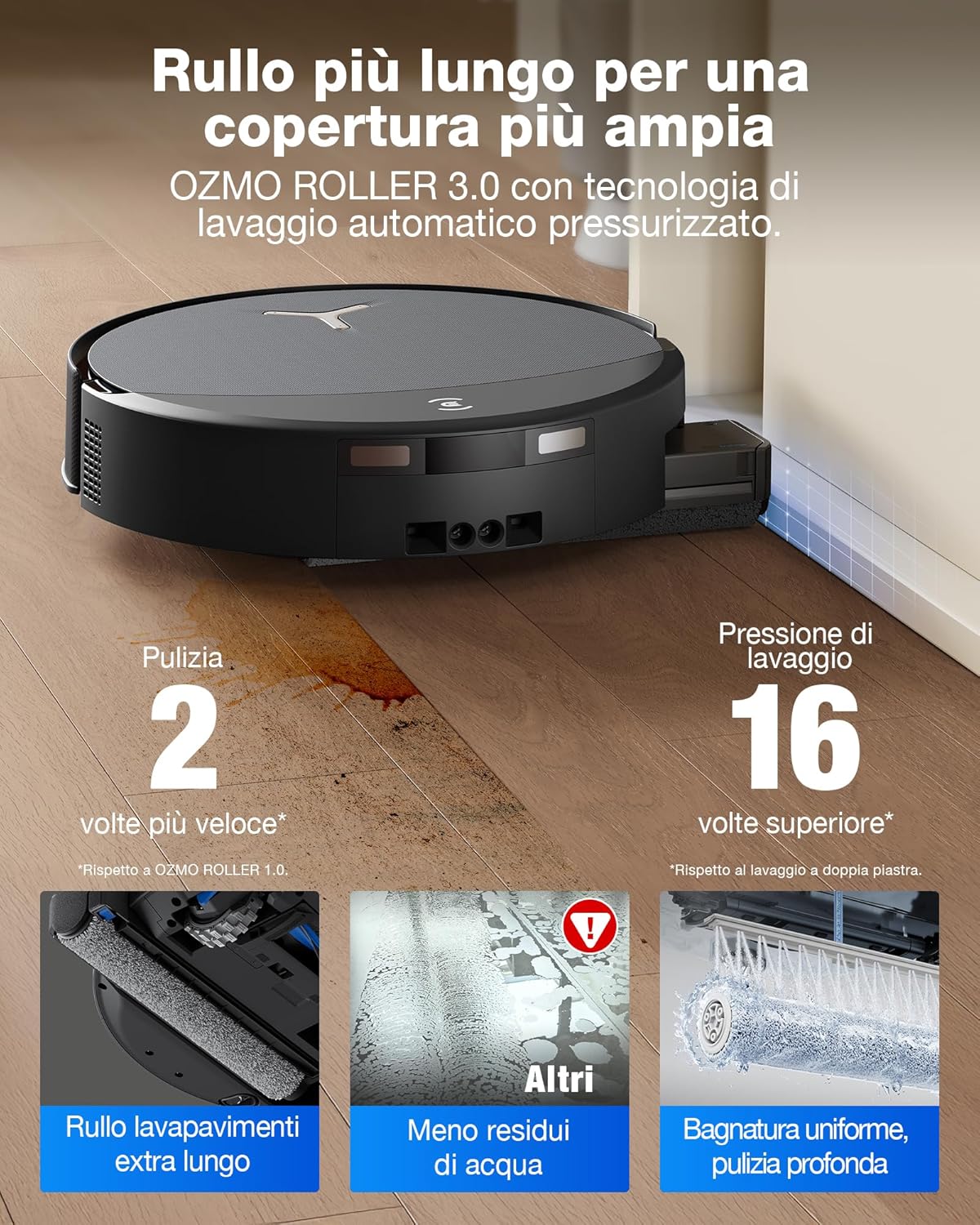 La più grande innovazione è però rappresentata dalla tecnologia OZMO ROLLER 3.0, la terza generazione del sistema di lavaggio proprietario dell’azienda che, rispetto al passato, utilizza un rullo più lungo del 50% (27 cm) che garantisce una copertura più ampia ed efficiente.