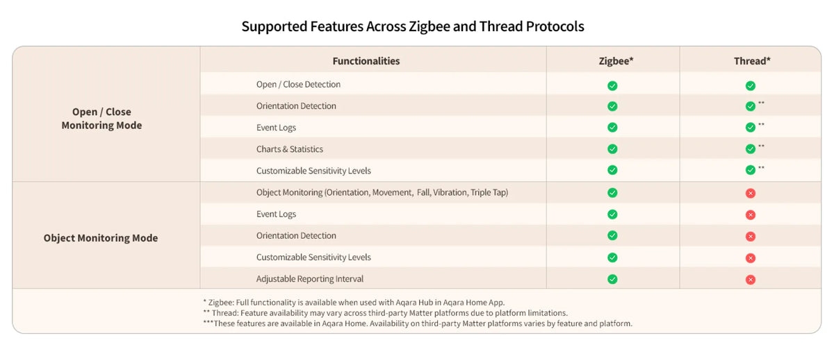 La seconda modalità, chiamata monitoraggio oggetti, è disponibile solo quando il sensore viene utilizzato con protocollo Zigbee tramite un hub Aqara. In questa configurazione, il dispositivo si trasforma in uno strumento di rilevamento avanzato capace di riconoscere orientamento (orizzontale, verticale, inclinato), movimento, caduta, vibrazione e triplo tocco. Questa versatilità apre scenari d’uso molto diversi rispetto ai sensori tradizionali, dal monitoraggio i cassetti e casseforti alla rilevazione di rottura di vetri, dal controllo dell’assunzione di farmaci alla cura di anziani e animali domestici.