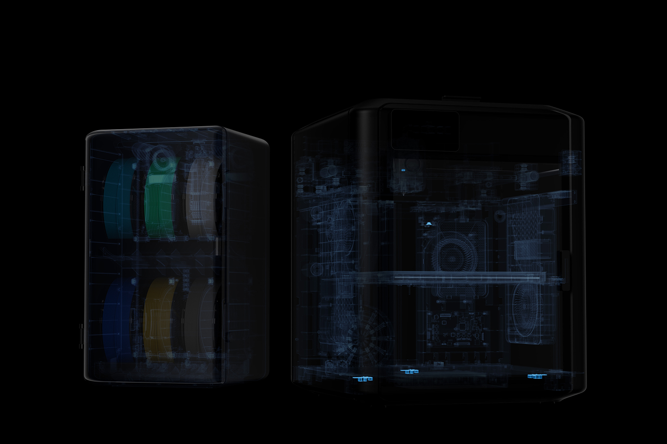 Cinquantatré sensori intelligenti e quattro telecamere basate su AI rilevano errori in tempo reale, calibrano automaticamente e correggono il processo di stampa. Il contenitore per filamenti RFD-6 mantiene l’essiccazione ottimale durante l’intera operazione. Una piattaforma software integrata gestisce configurazione, slicing, stampa e controllo remoto.